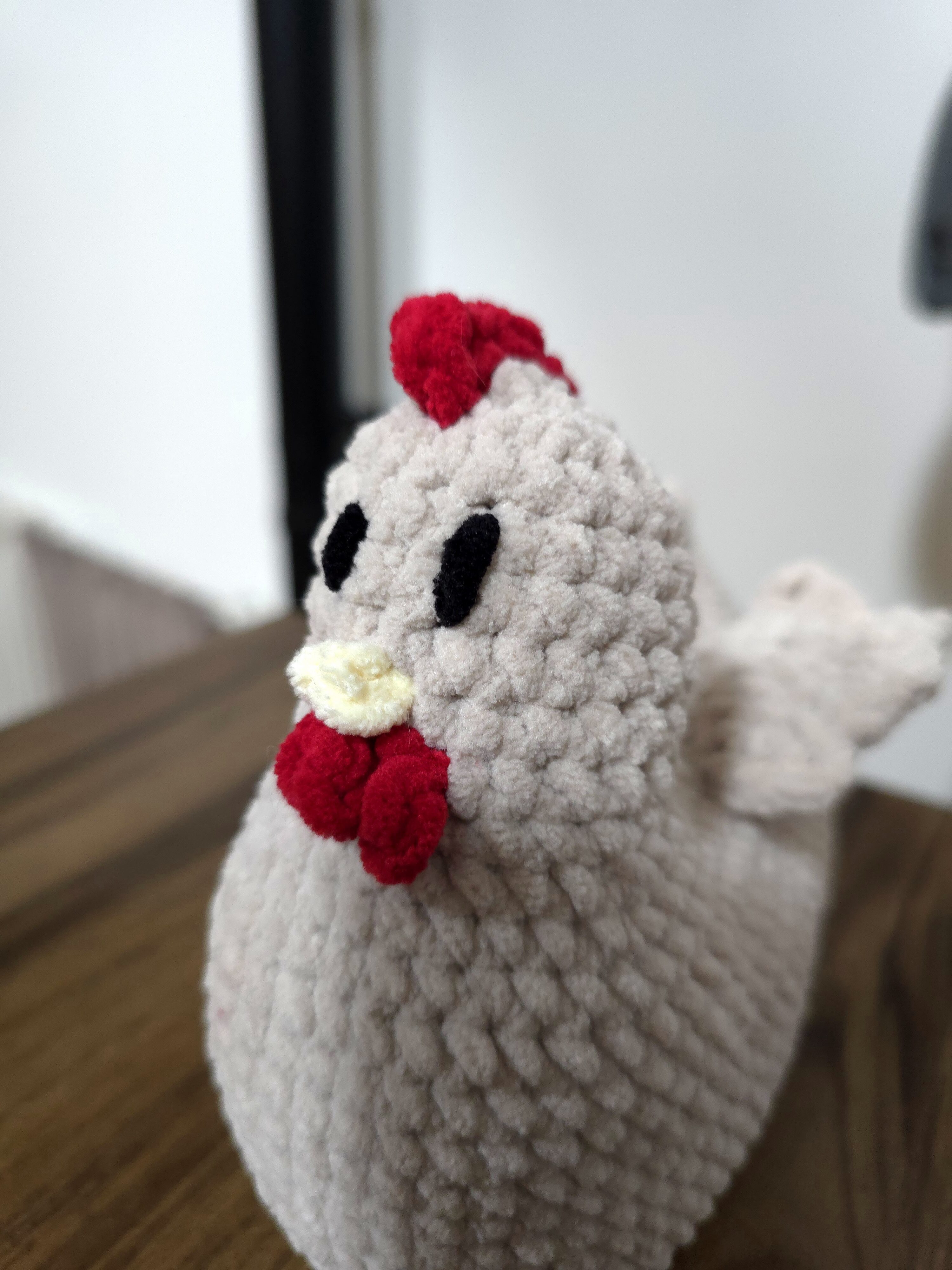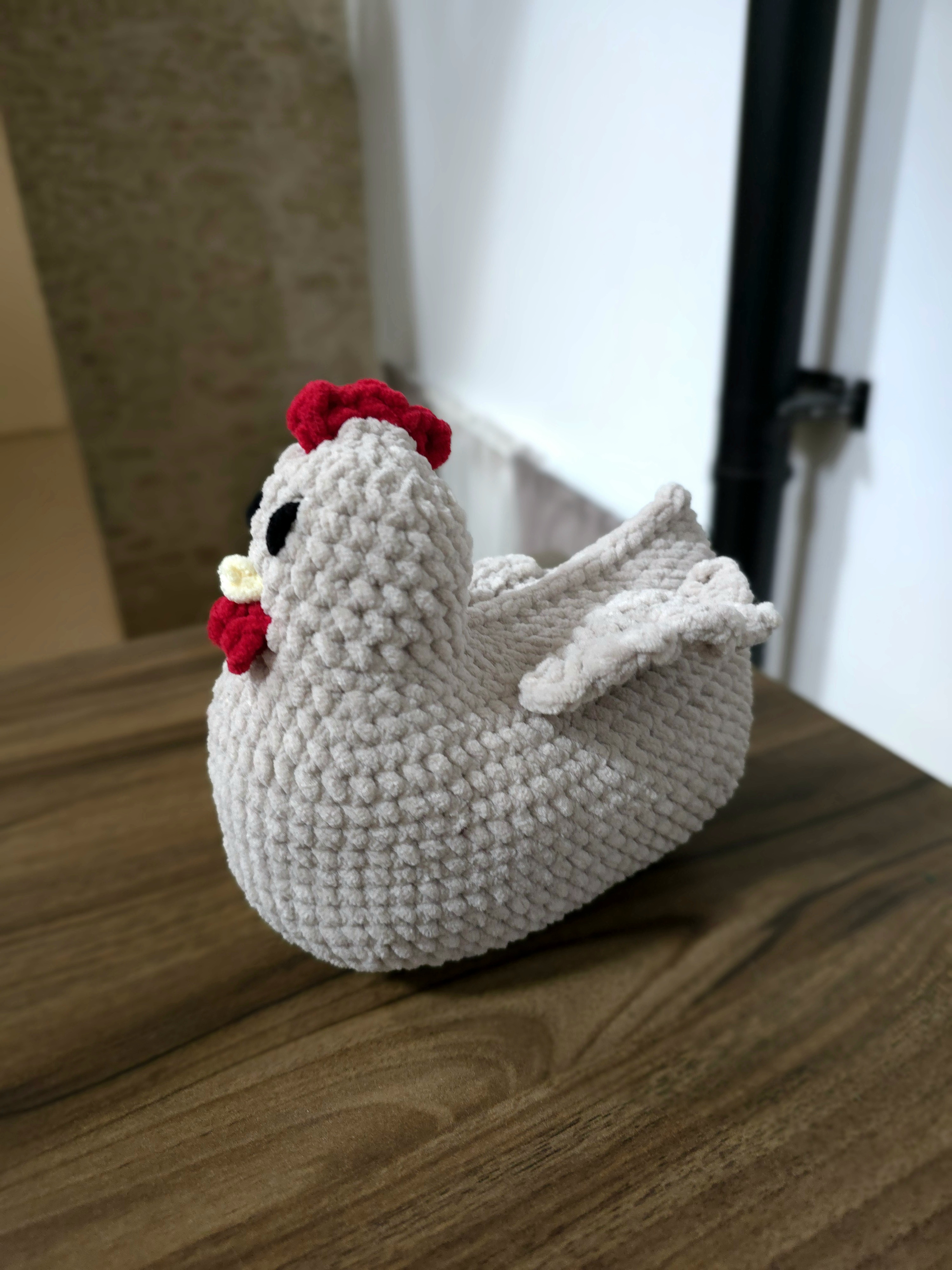 - Design Artisanal : Chaque poule est unique, réalisée avec soin et souci du détail (bec jaune, crête et barbillons rouges).