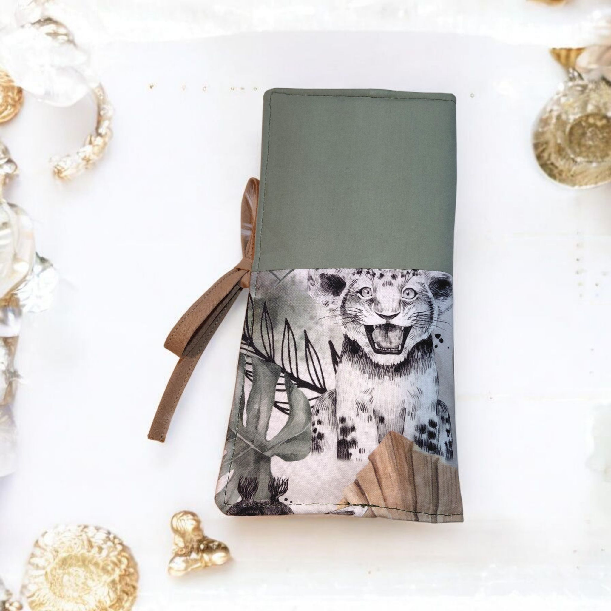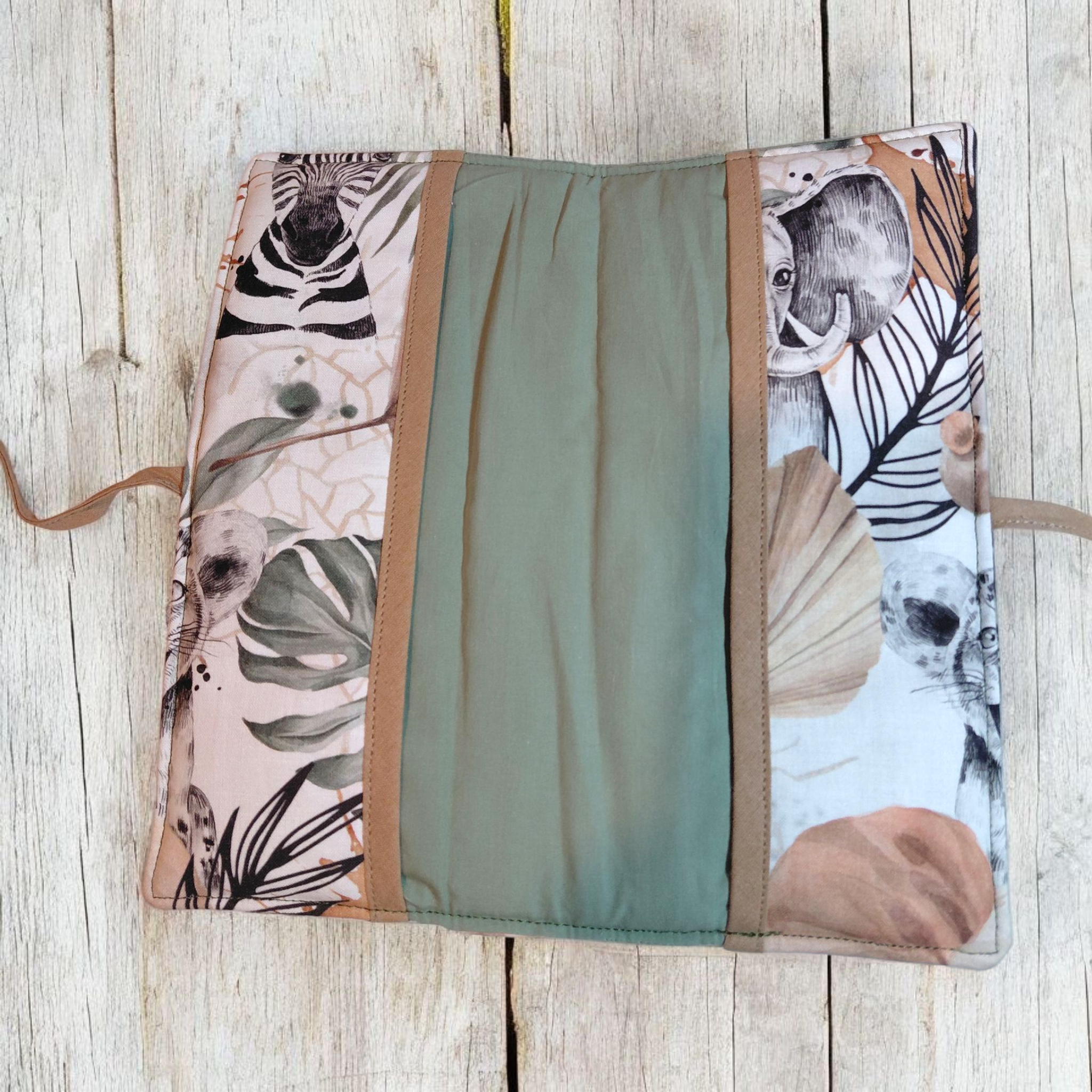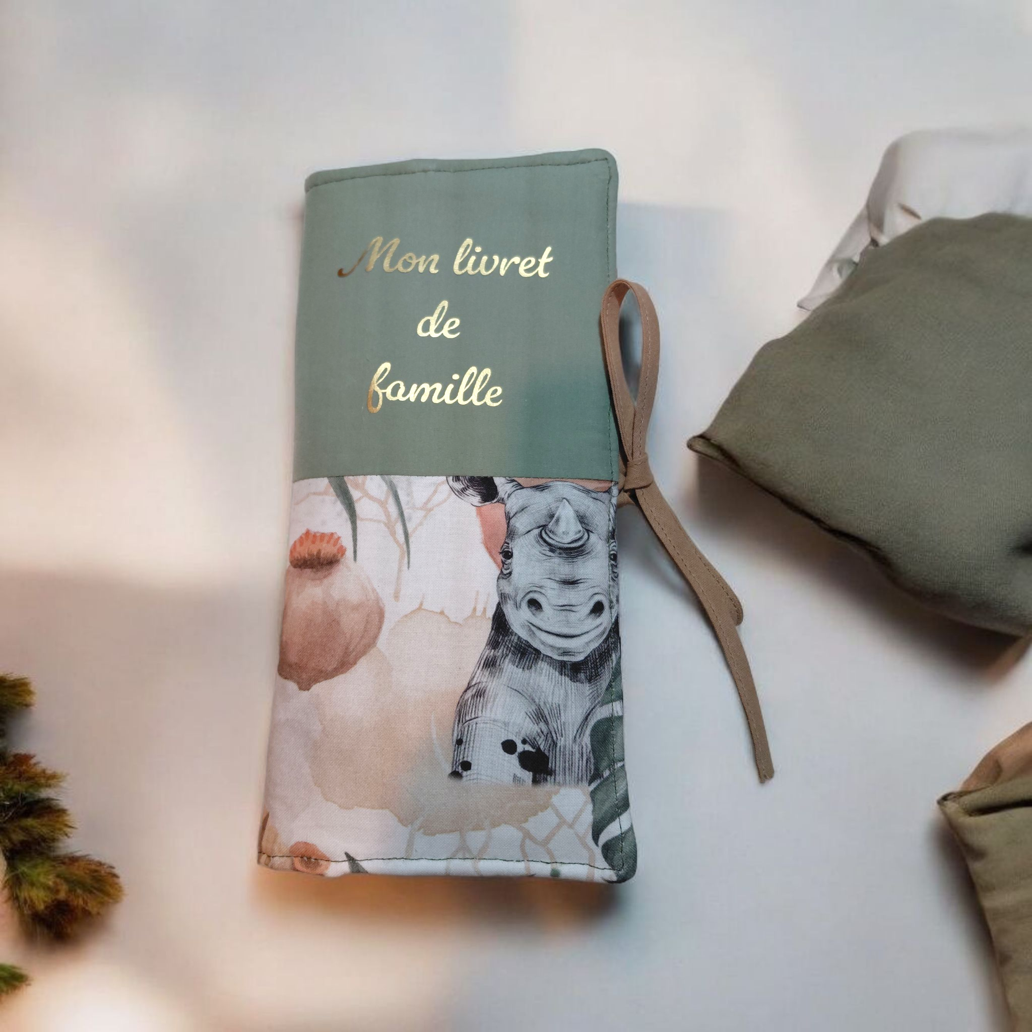 Découvrez ce protège-livret de famille artisanal, issu de la collection Savane, une gamme chaleureuse en coton imprimé aux motifs animaux de la savane.