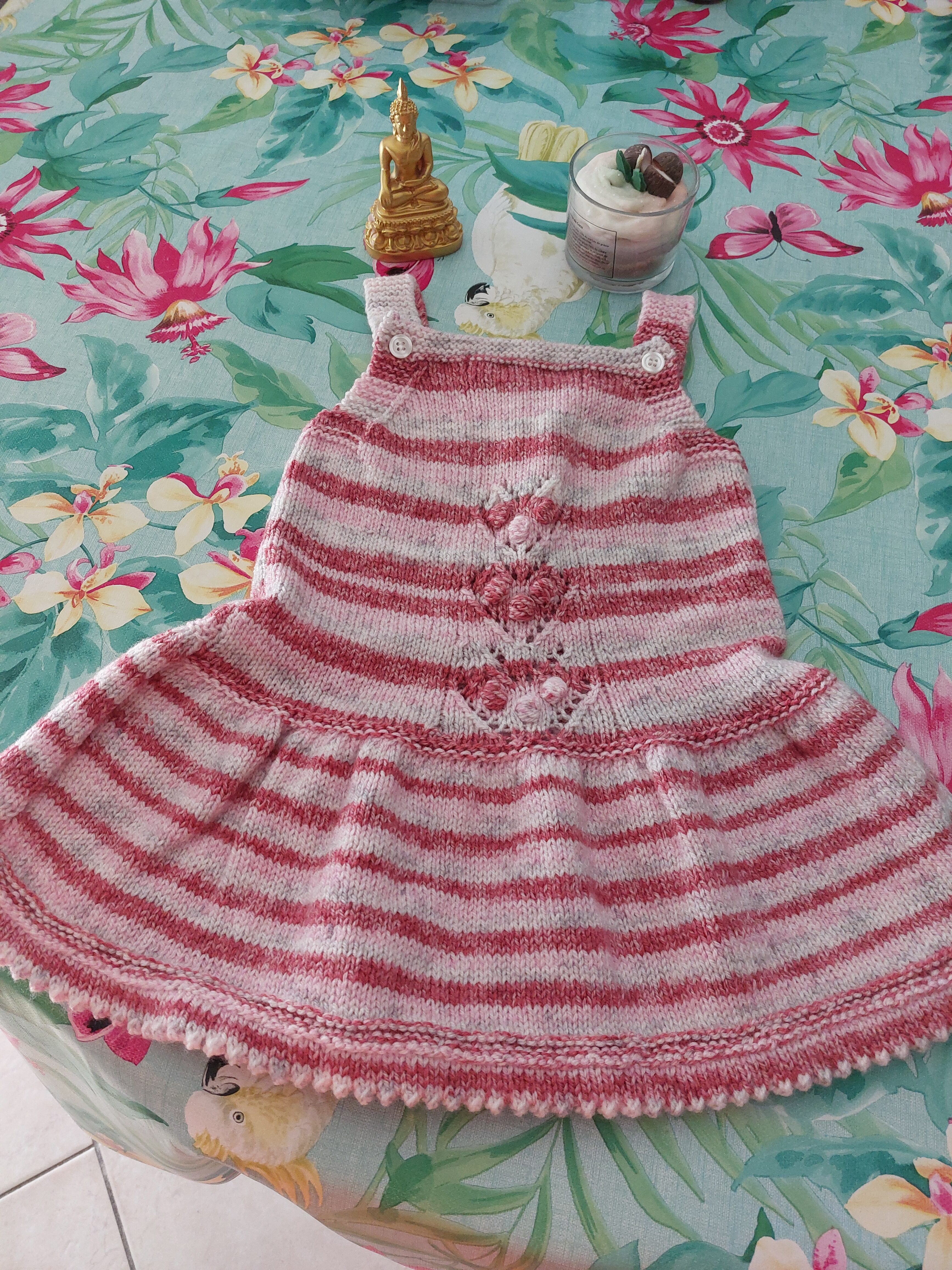 tricotée aux aiguilles dans un joli point fantaisie, avec motifs pop corn sur le devant et dents de chat dans le bas de la robe