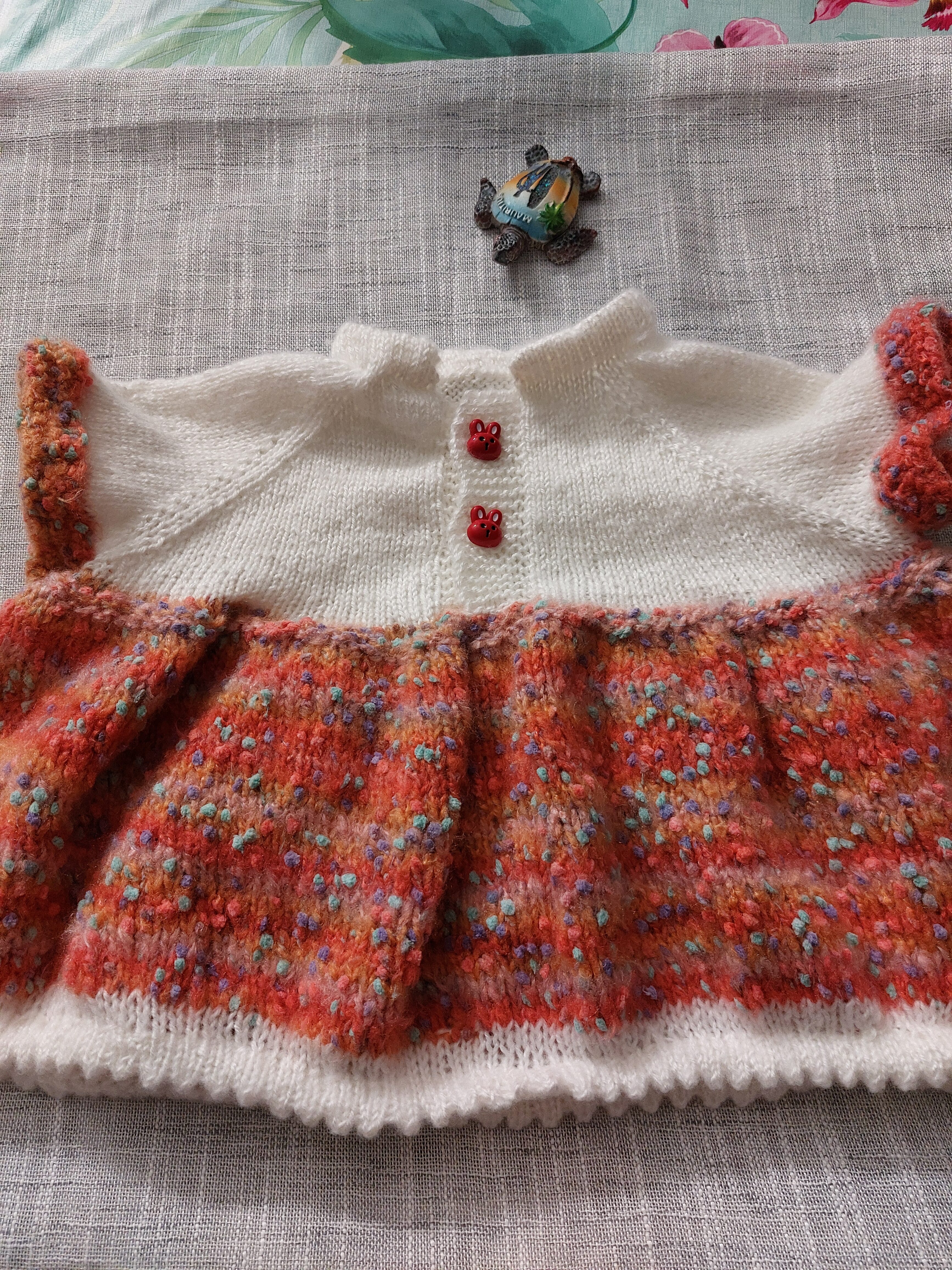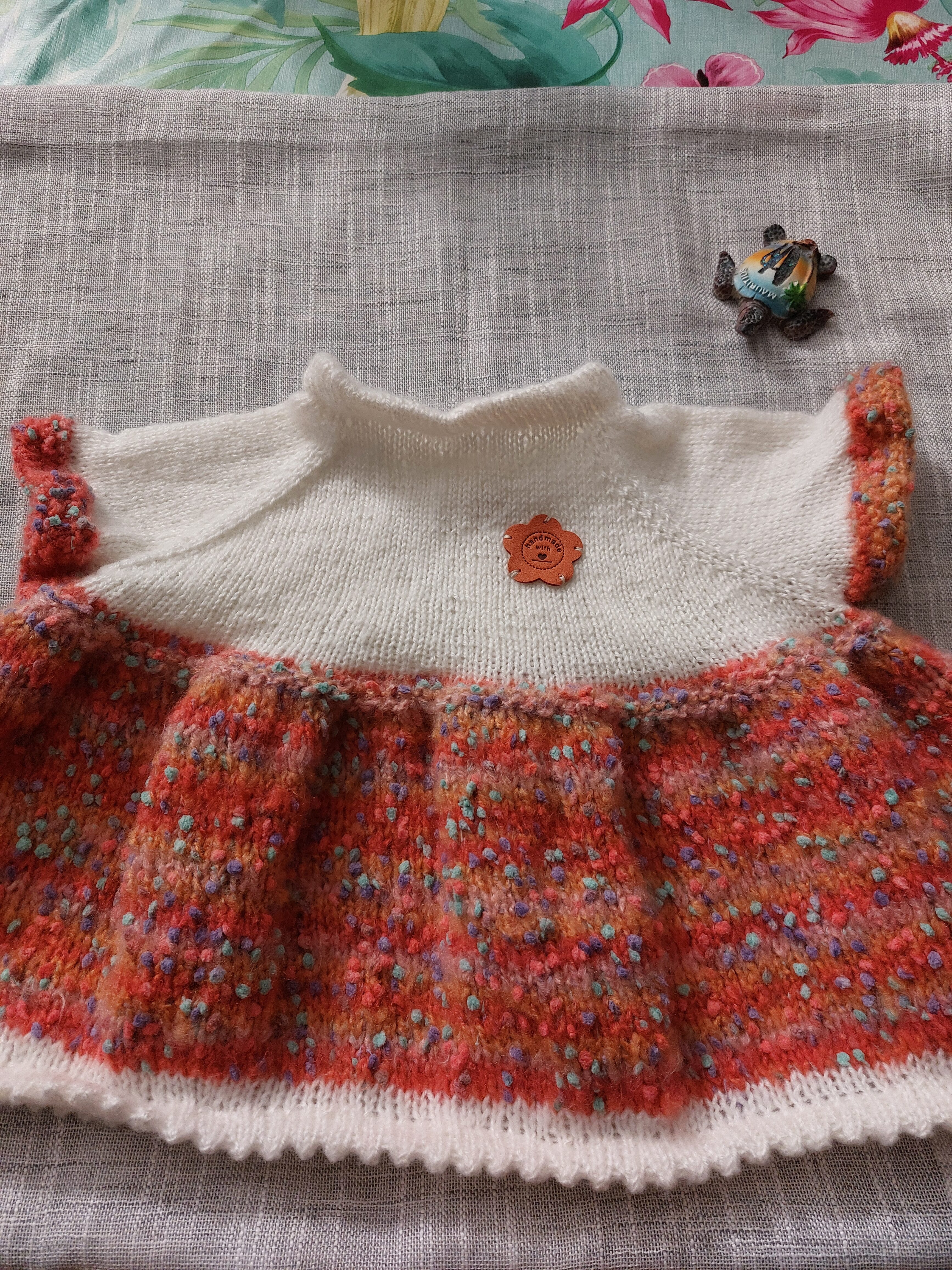 faite entièrement à la main dans un coloris très doux : blanc cassé pour le haut et multicolor pour le bas
