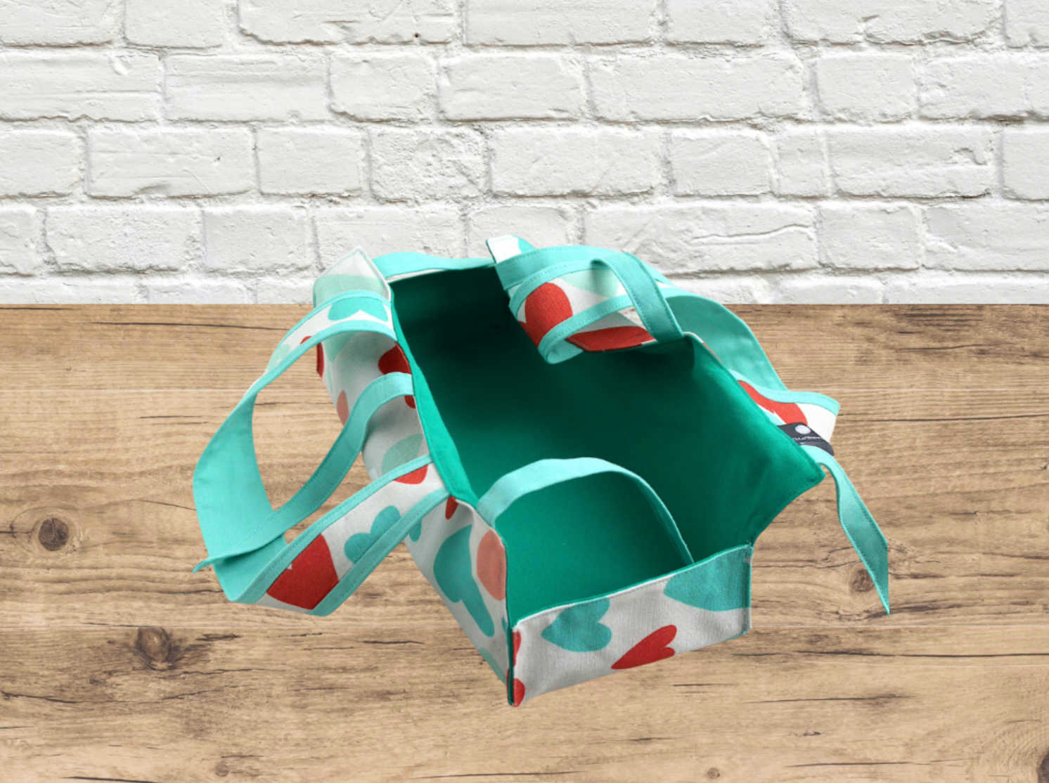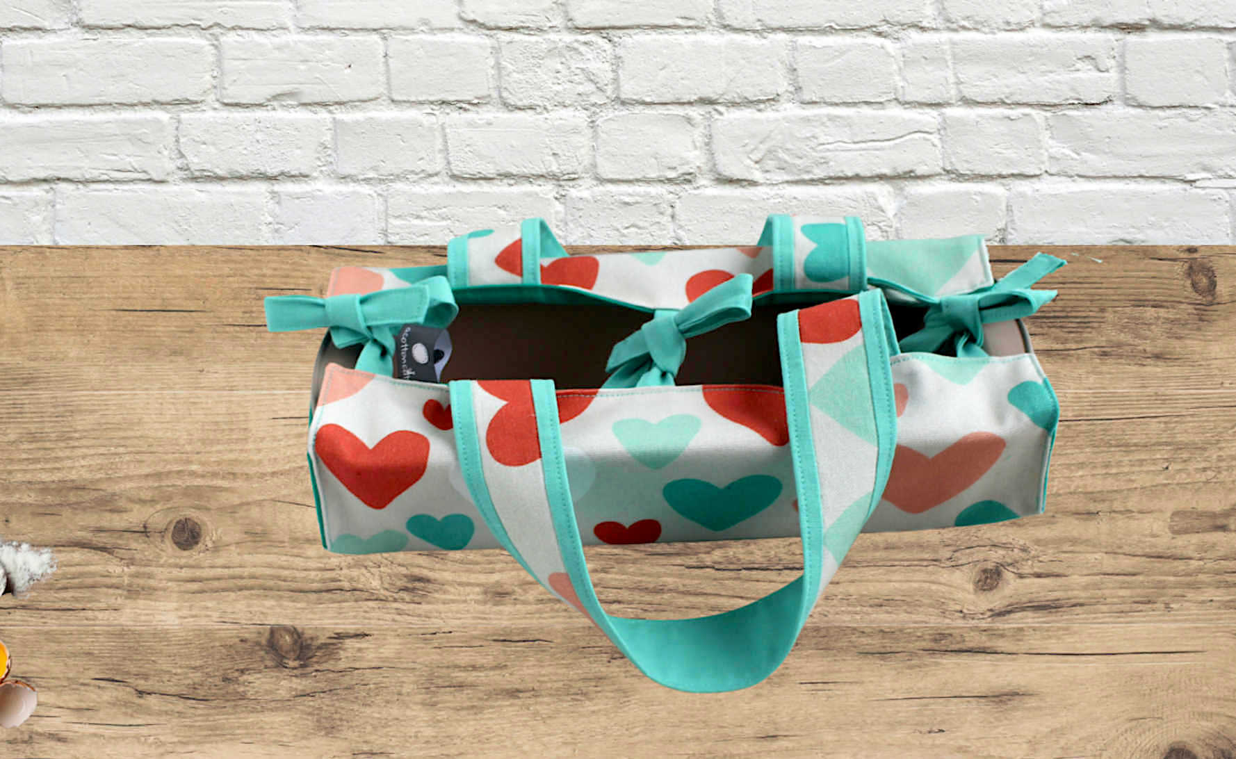 Confectionné en coton extérieur épais motif coeurs et doublé avec coton vert. Il est doté de 2 anses en coton et de 6 liens pour un transport stable et sûr.