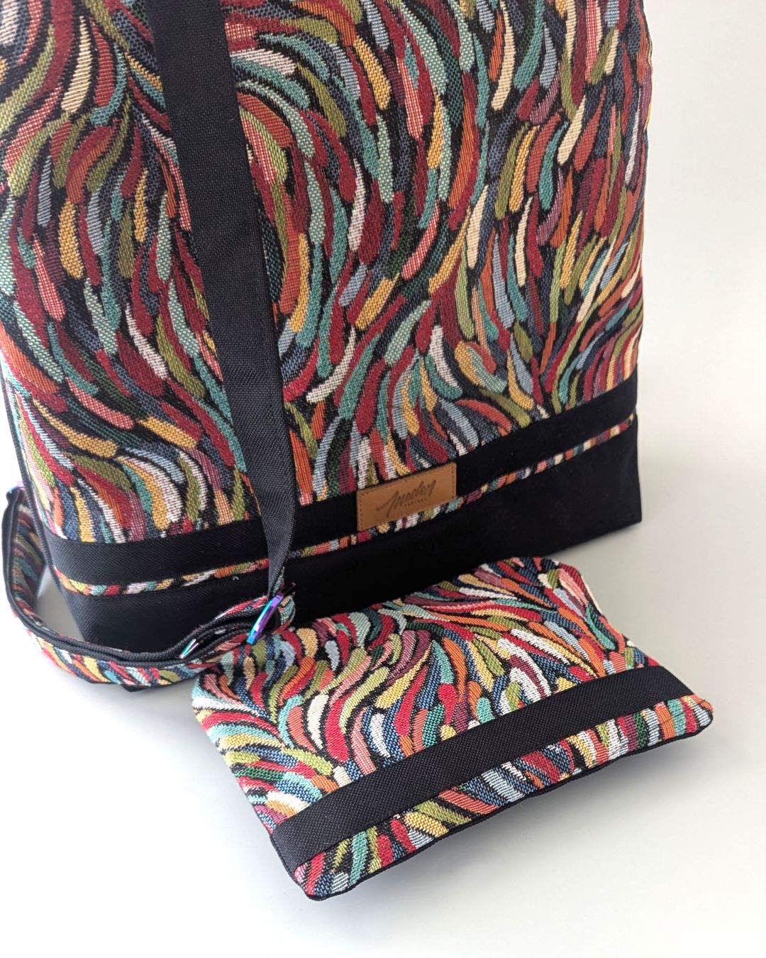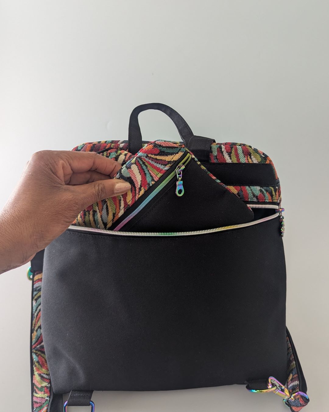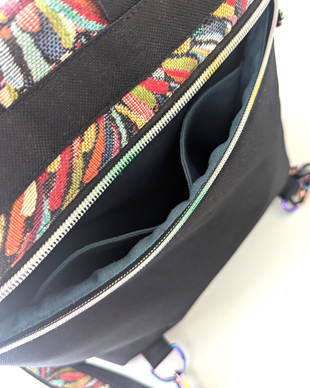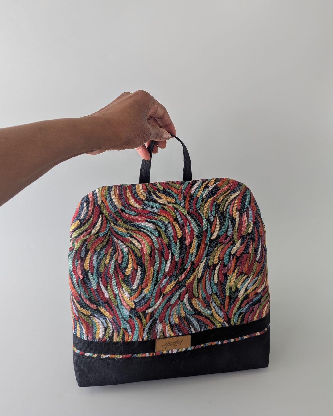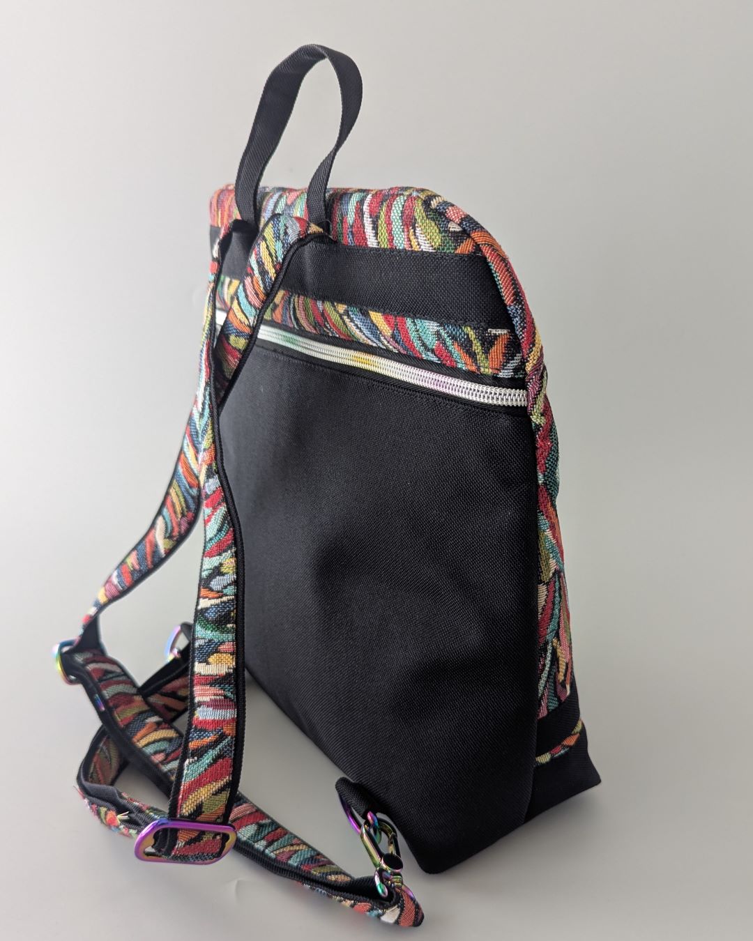 Le Volte est un sac à dos féminin et citadin pensé pour les femmes actives qui ne veulent pas choisir entre élégance et tranquillité d’esprit. Son jacquard multicolore aux reflets chatoyants contraste avec la toile à sac noire structurée pour un résultat à la fois graphique et sophistiqué.