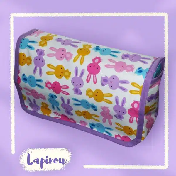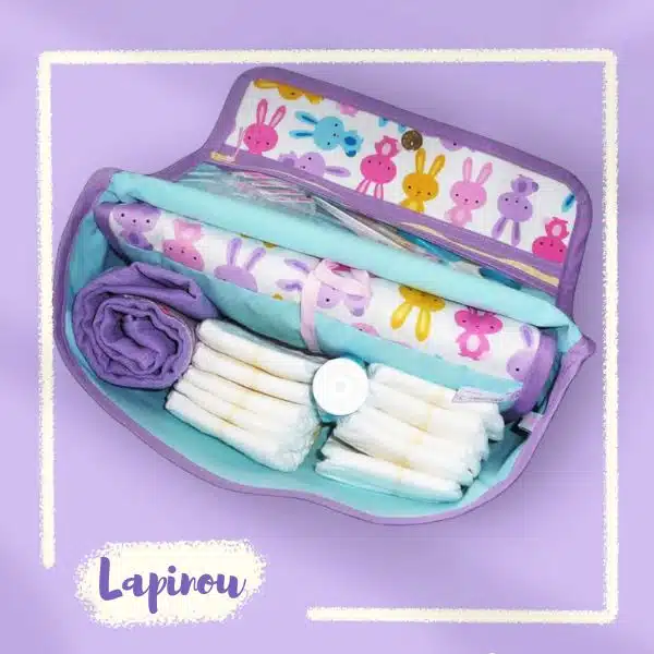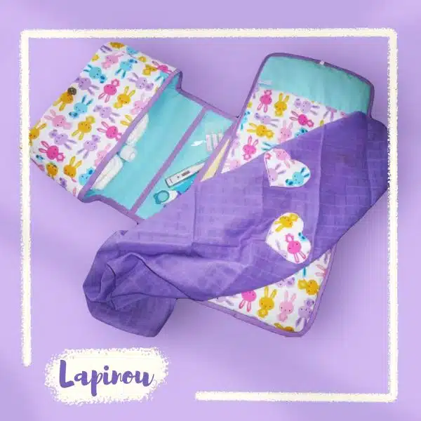 PARTICULARITE : Le lange-doudou, le doudou idéal pour les moments câlins, peut également servir de couverture fine ou de bavoir . Le matelas à langer est capitonné pour un meilleur confort pour bébé lors du change. Il s’enroule et se noue. Le sac comporte une poche zippée dans le rabat afin d’y stocker les petits accessoires de bébé tels que paire de ciseaux, thermomètre, pansements, pipettes de sérum physiologique, pipettes d’éosine aqueux, cotons, … Se glisse dans le panier de la poussette, dans le sac cabas de maman, dans la valise, … Le tout est lavable en machine à 40°.