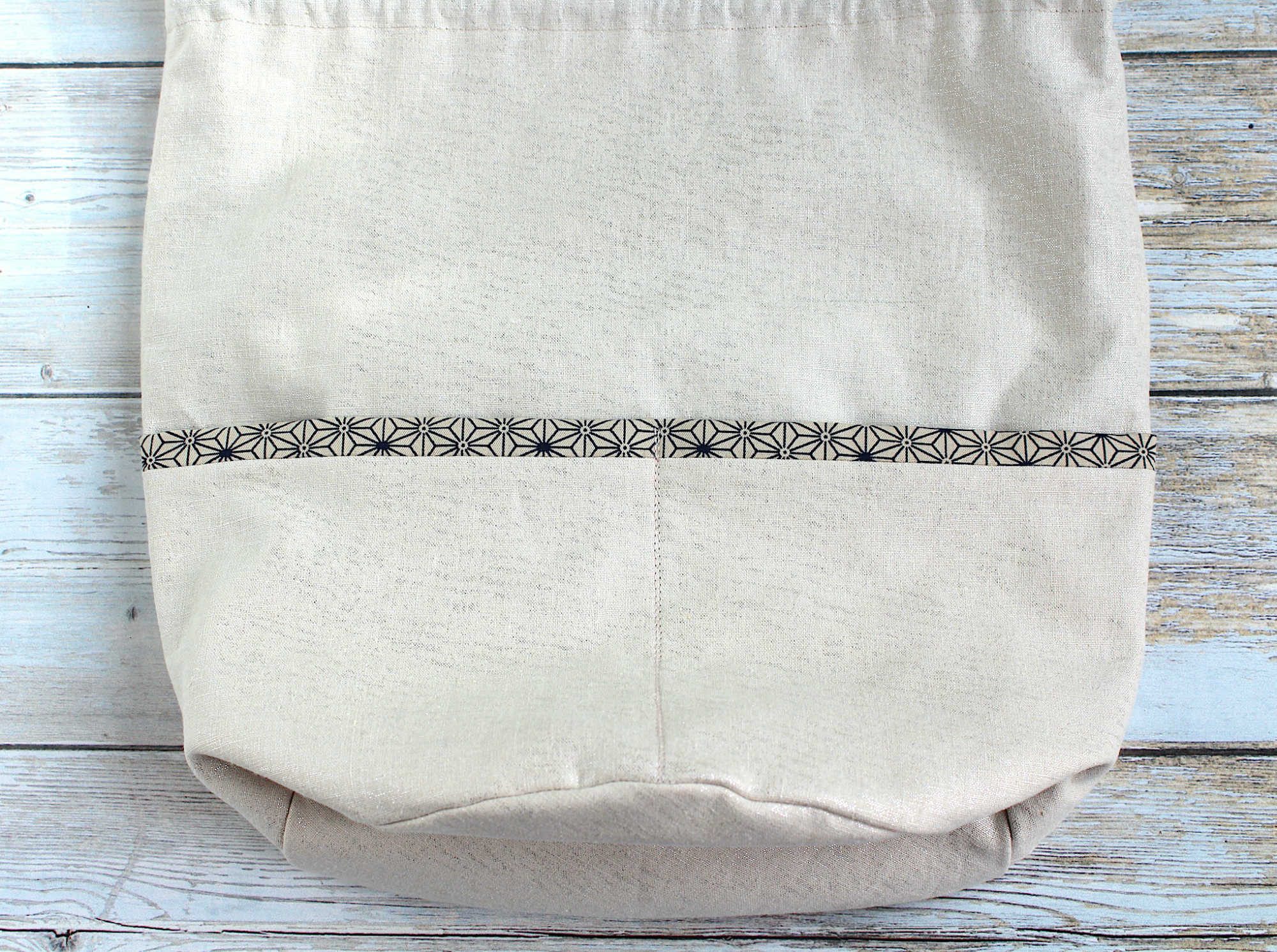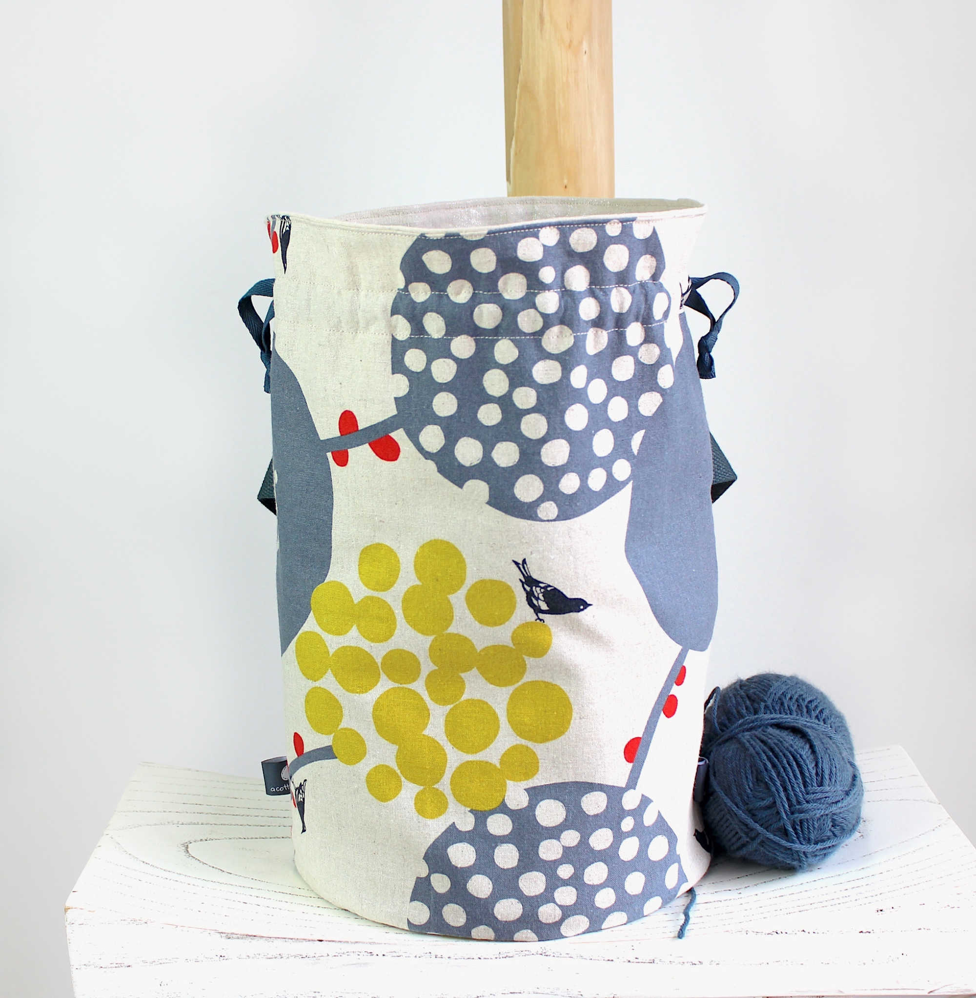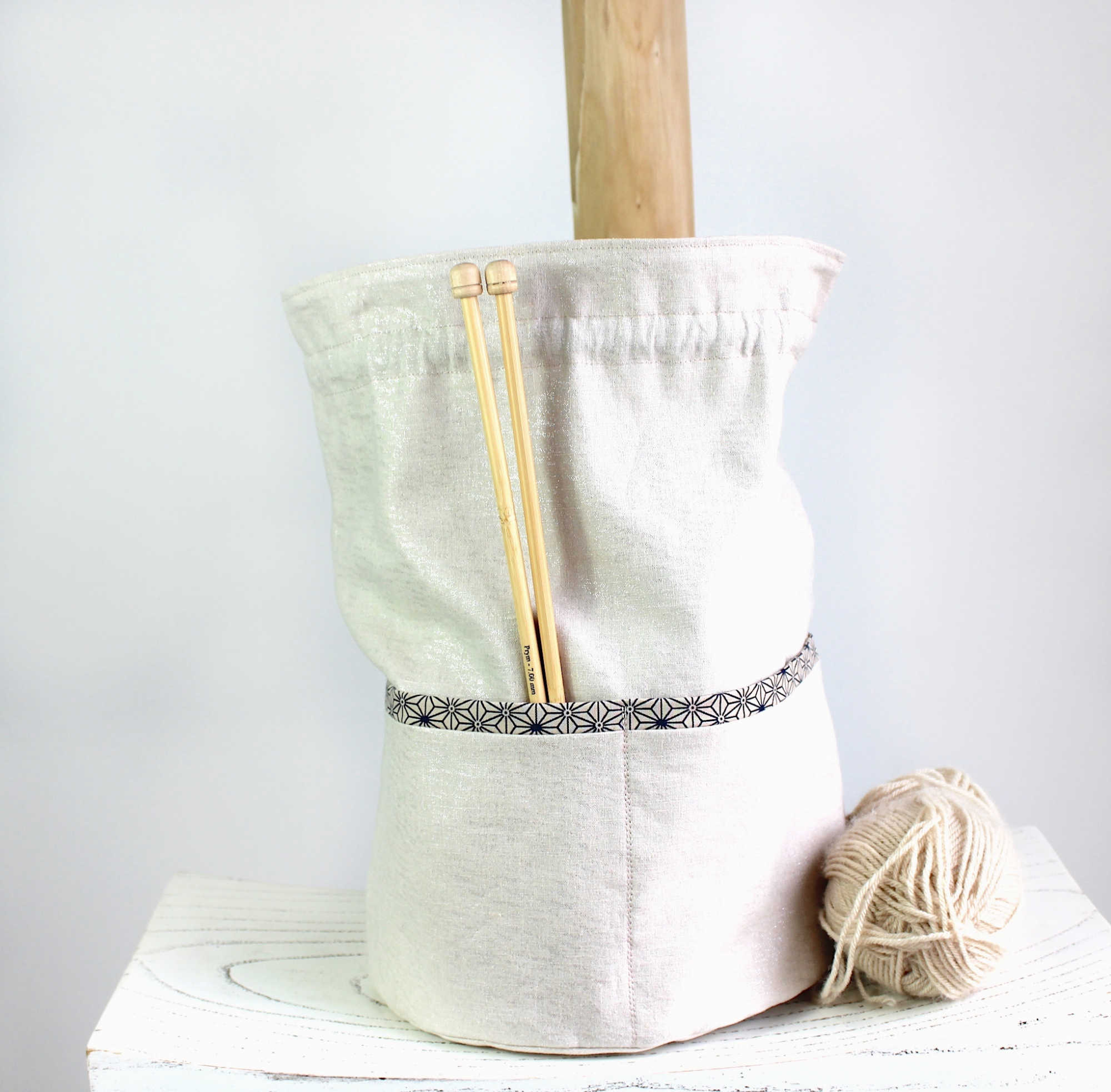 Grand sac à projets tricot en tissu japonais lin et coton. Grand pochon doté de 4 poches de rangement intérieures. Il est doublé et tissu lin coton légèrement argenté.