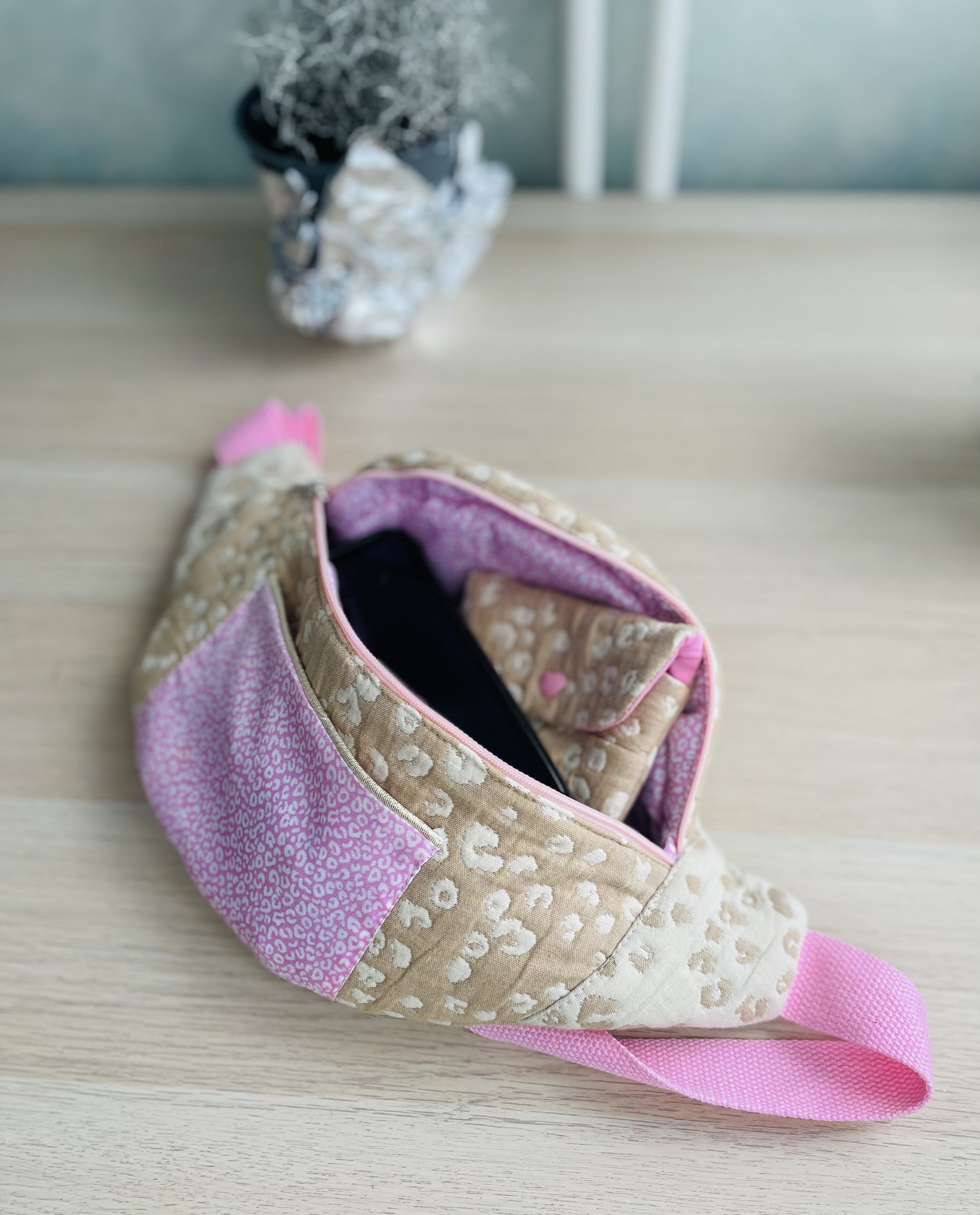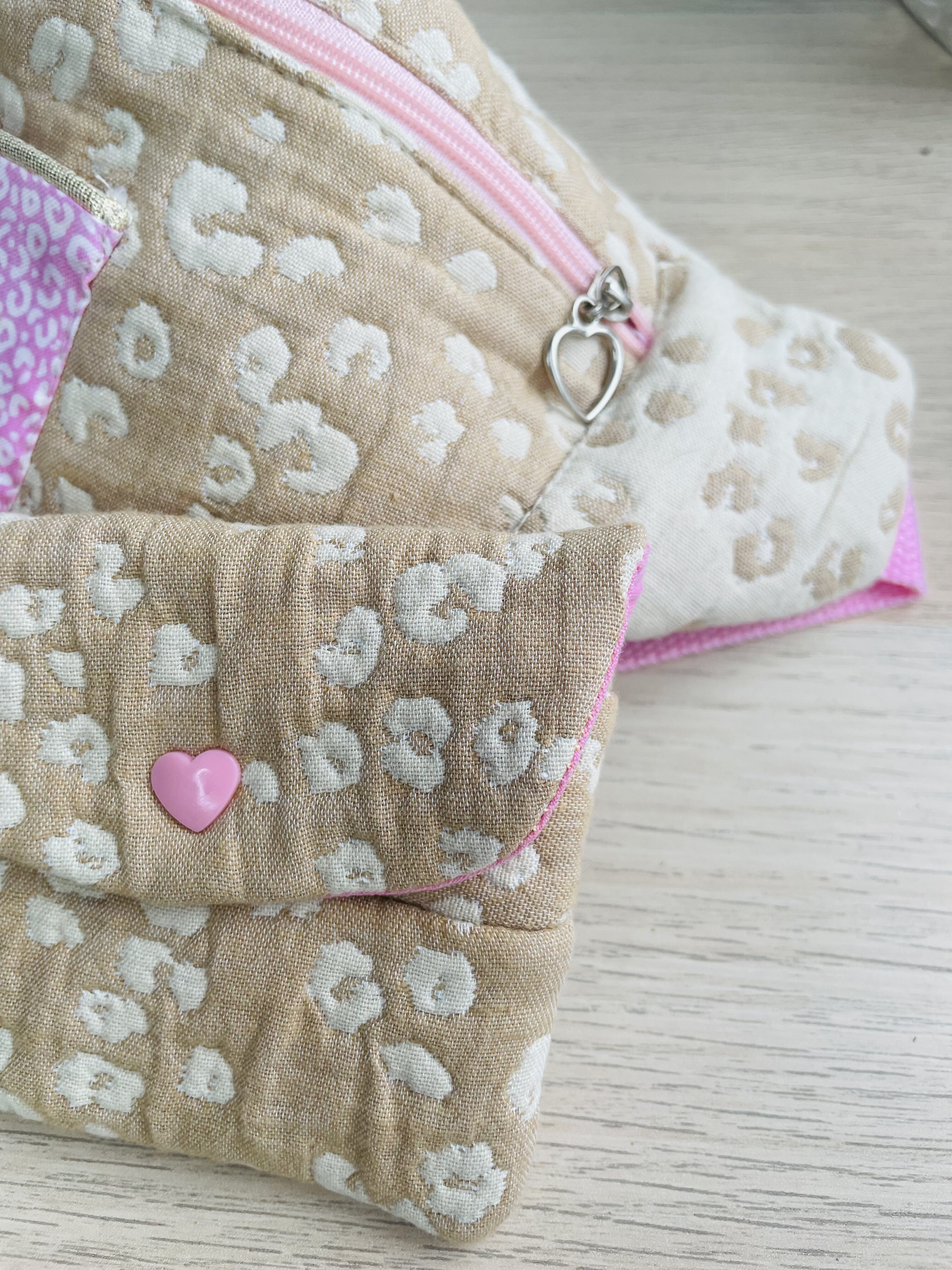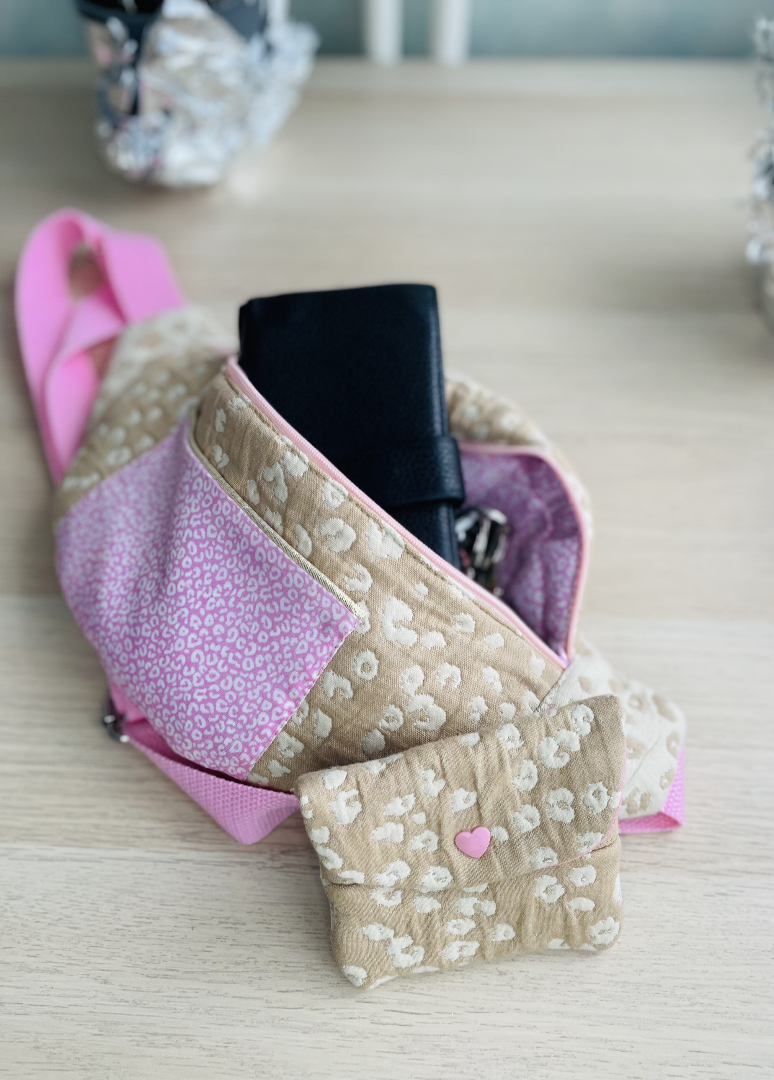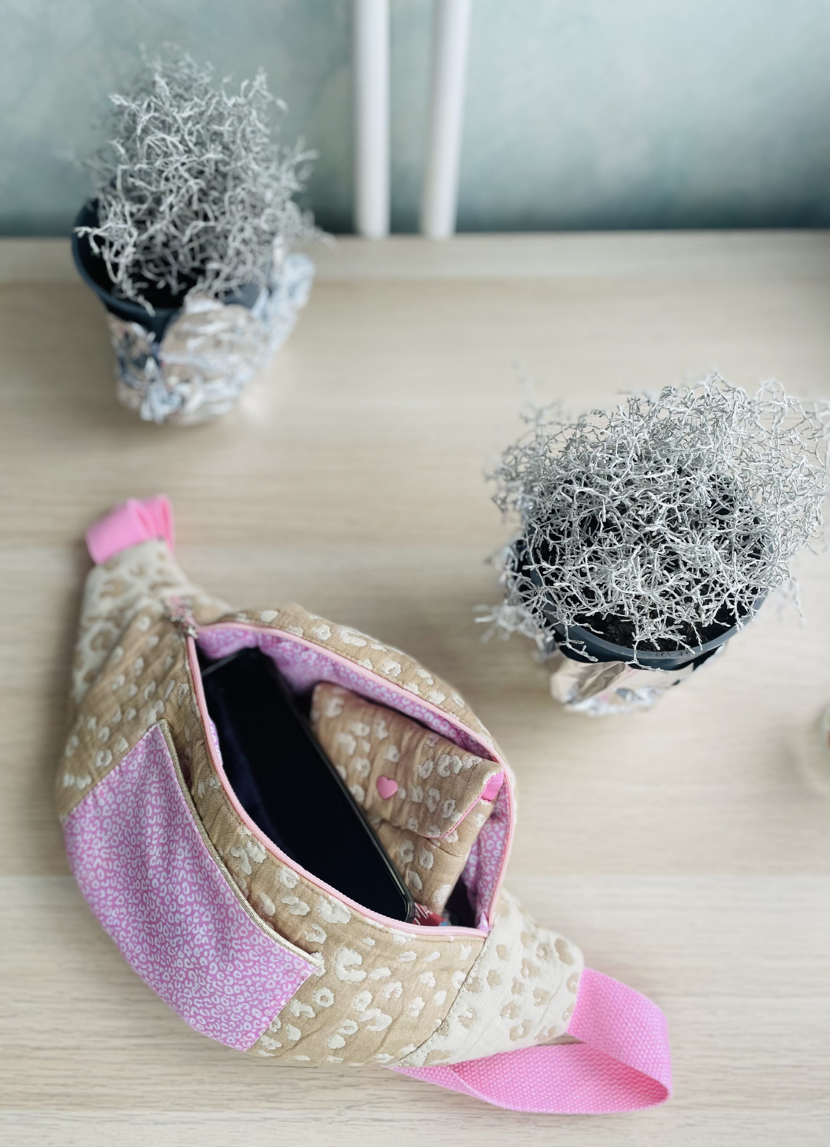 Et voilà, inspirée par mes créations, et ayant du rab, j’ai réalisé cette banane dans les mêmes tons, parce que je trouve que le rose et léopard se marient vraiment trop bien.