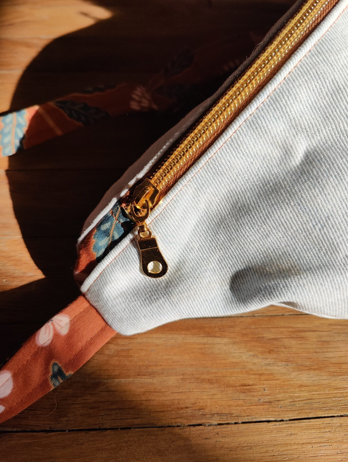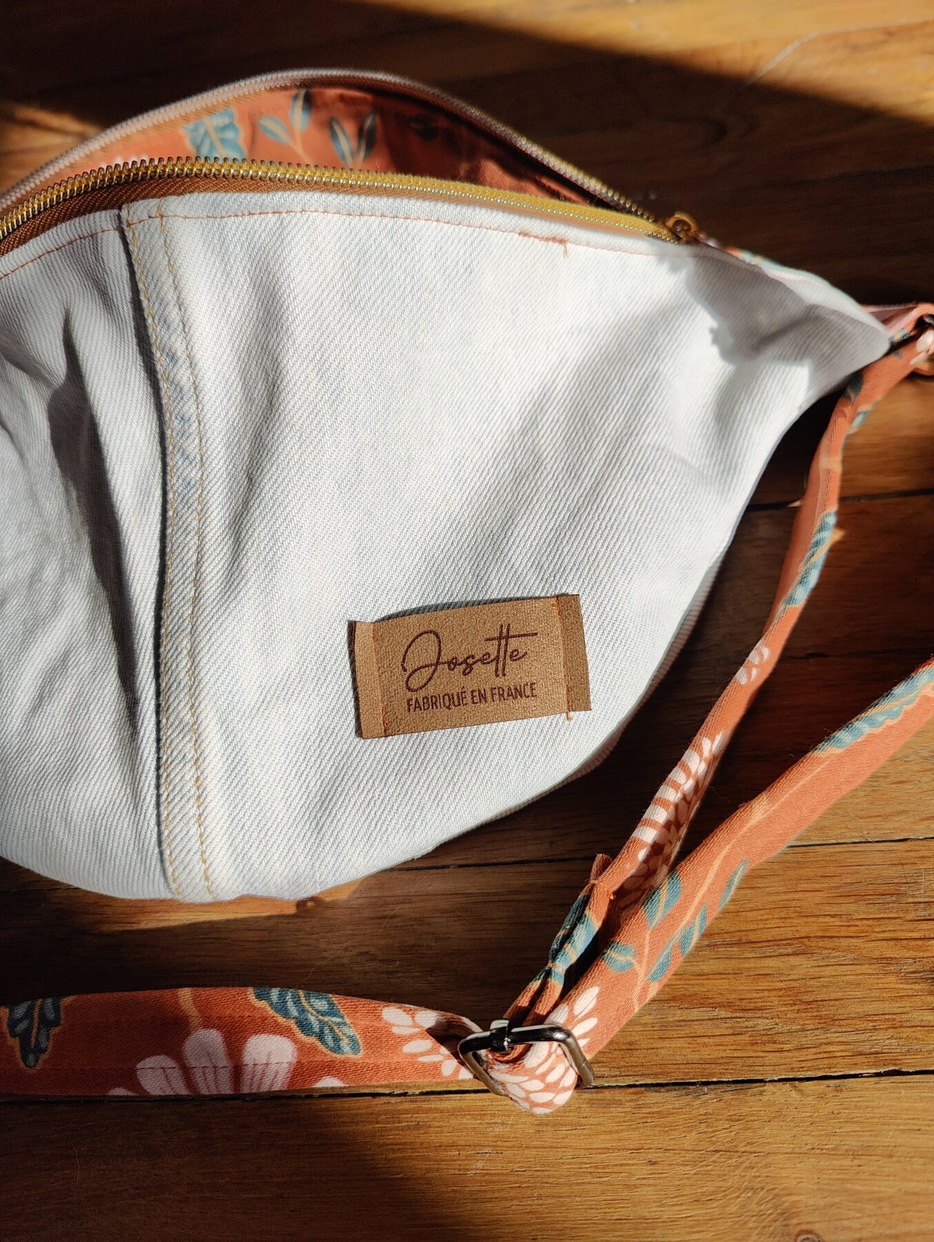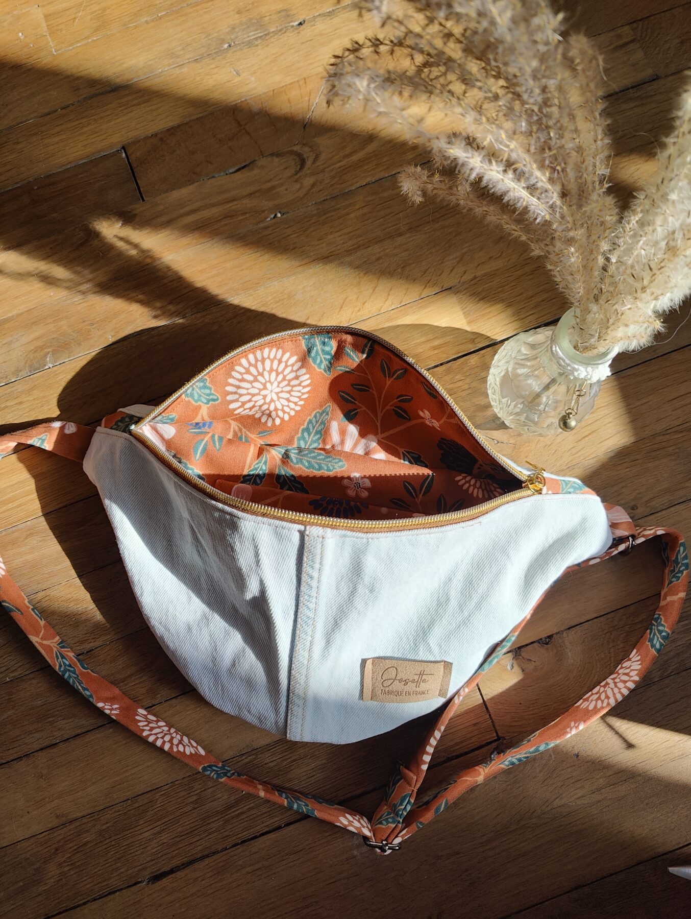 - Extérieur : jean bleu ciel/blanc léger. Intérieur : tissu de seconde main marron parsemé de fleurs naturelles