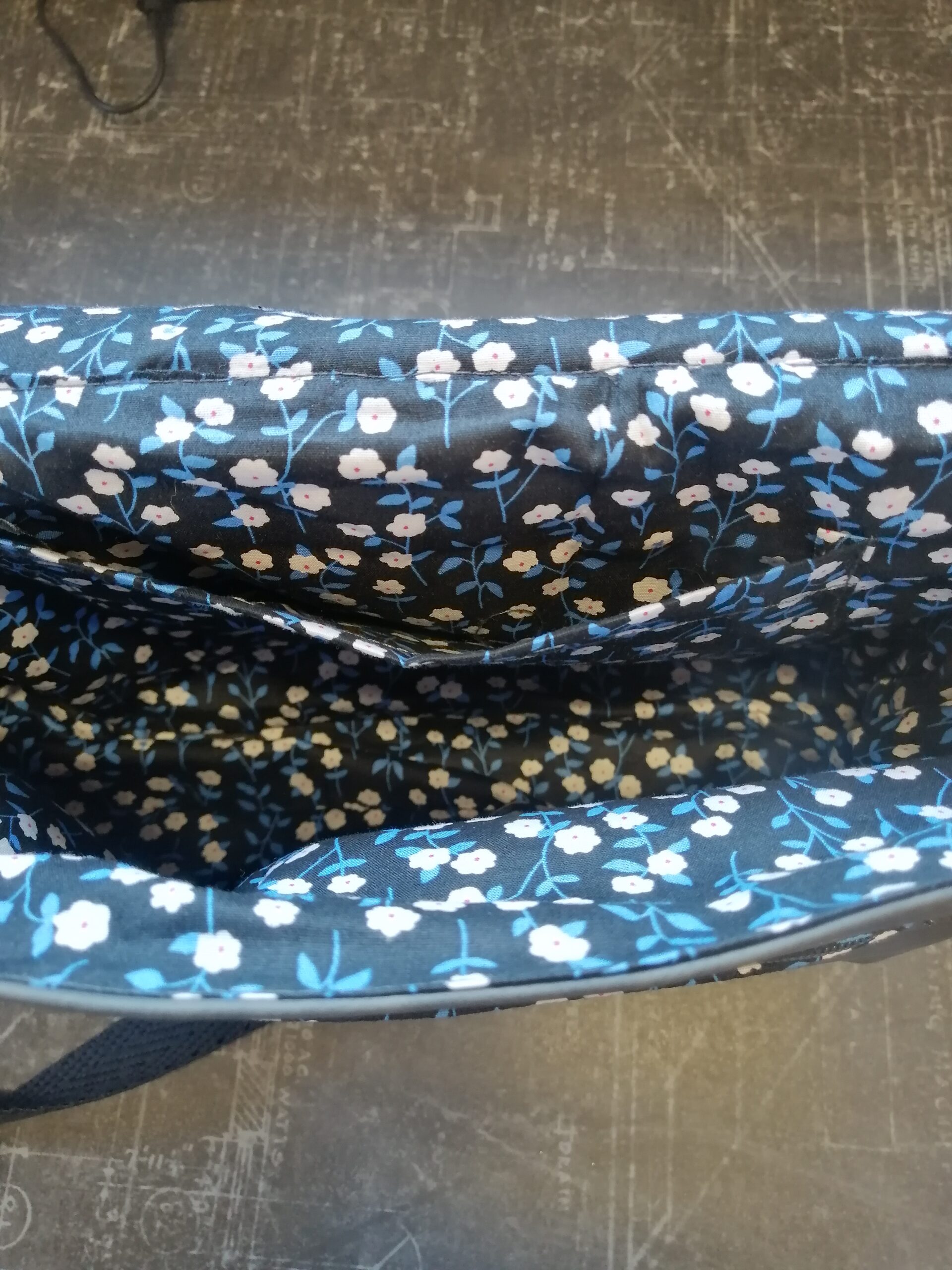 Sac bandoulière en simili gris foncé et tissu coton à motifs. Une poche sur le devant fermée par un zip. Sac fermé par un bouton aimanté. Dimensions 30x20x7