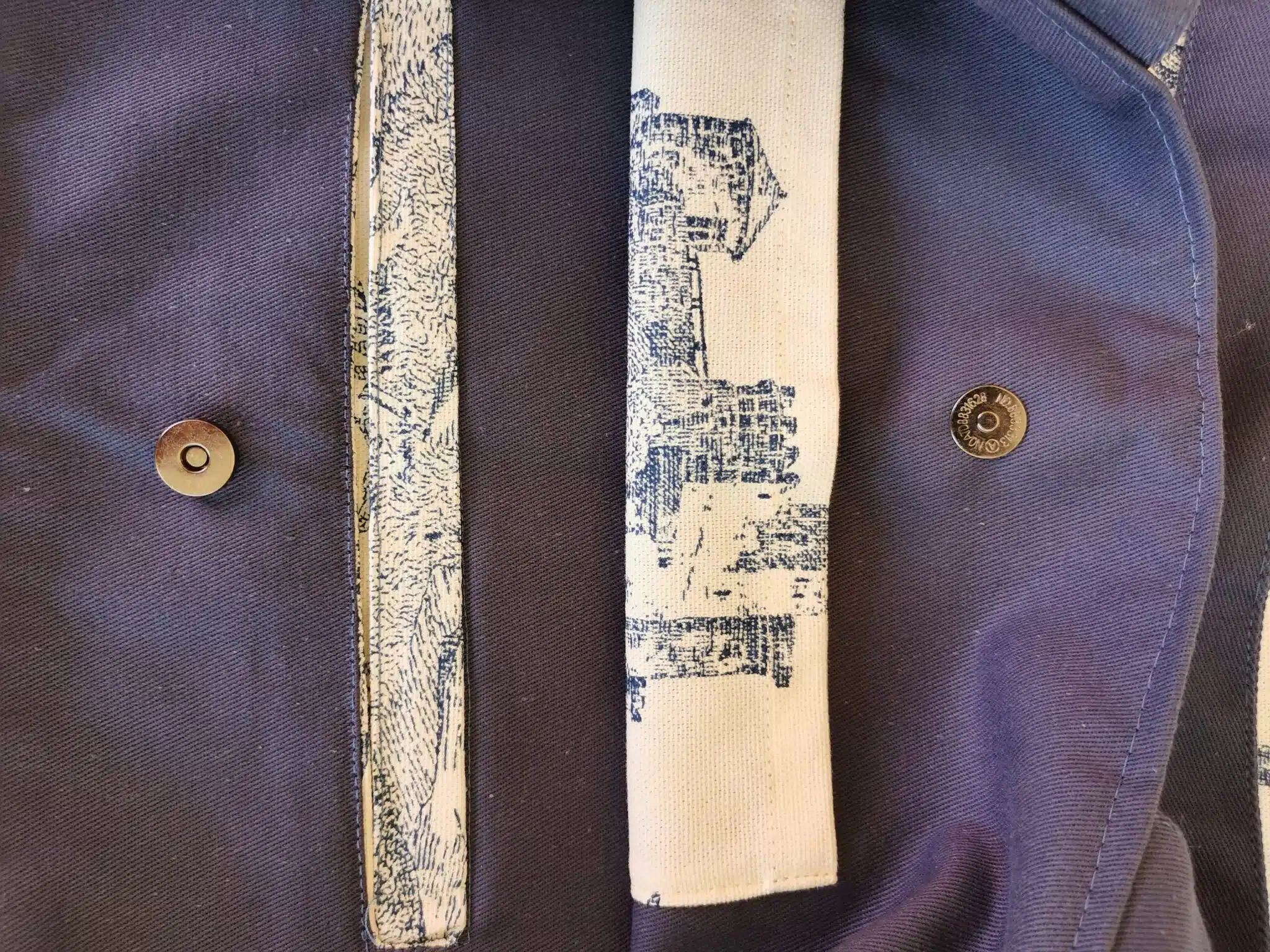 J’ai réalisé ce sac cabas dans un tissu toile de Jouy. Il est doublé avec un coton bleu. Il se ferme avec un gros bouton pression Il a une poche intérieure passepoilée et une poche simple.