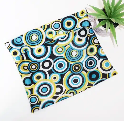 COMPOSITION : PUL contact alimentaire Bio. Il est imperméable, très résistant et respirant/ Pression : résine Oeko-Tex 100.