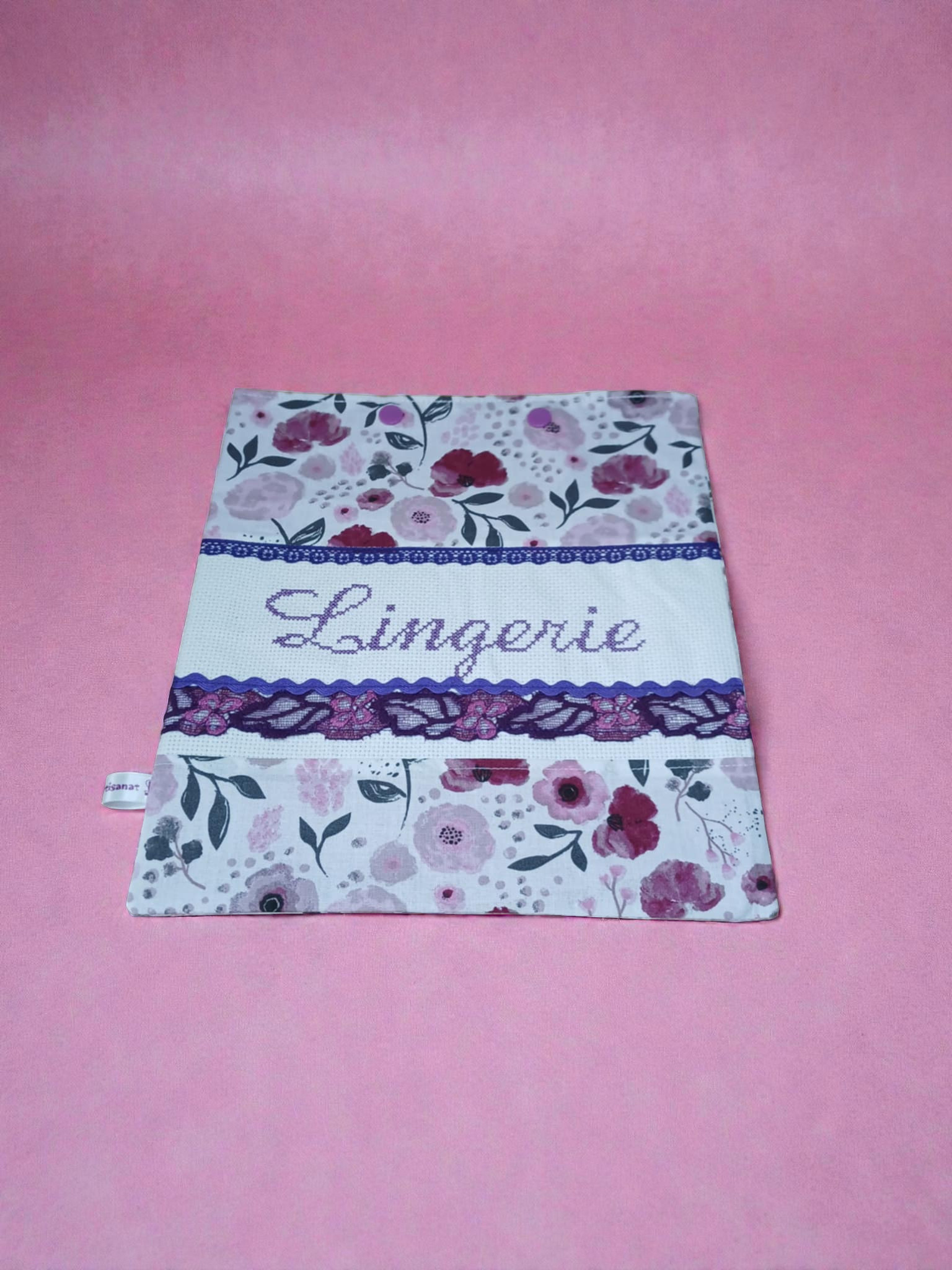 Elle est en coton est brodée à la main dans des tons associés aux couleurs du sac. Les détails en dentelle ajoutent une touche d’élégance supplémentaire.