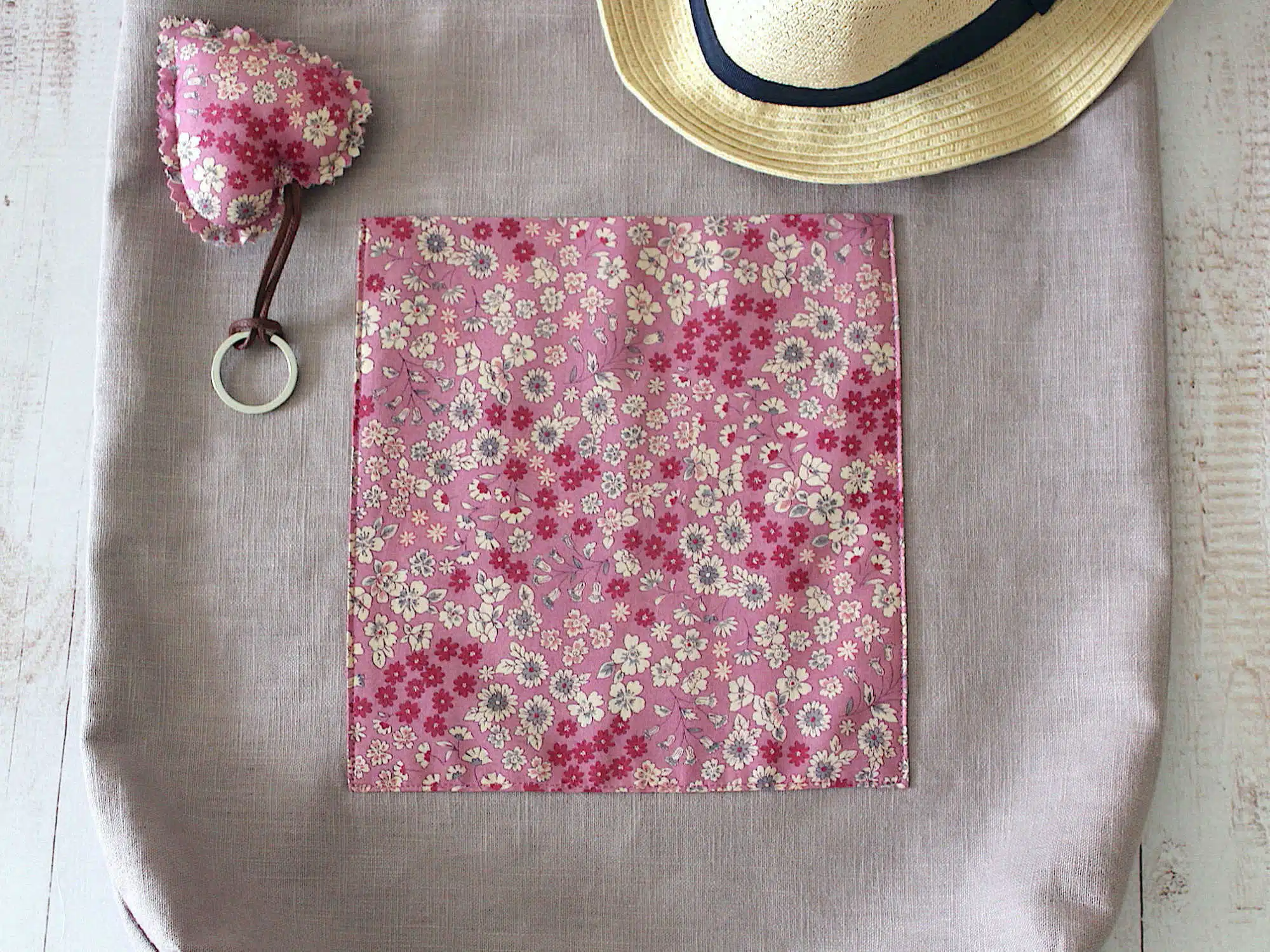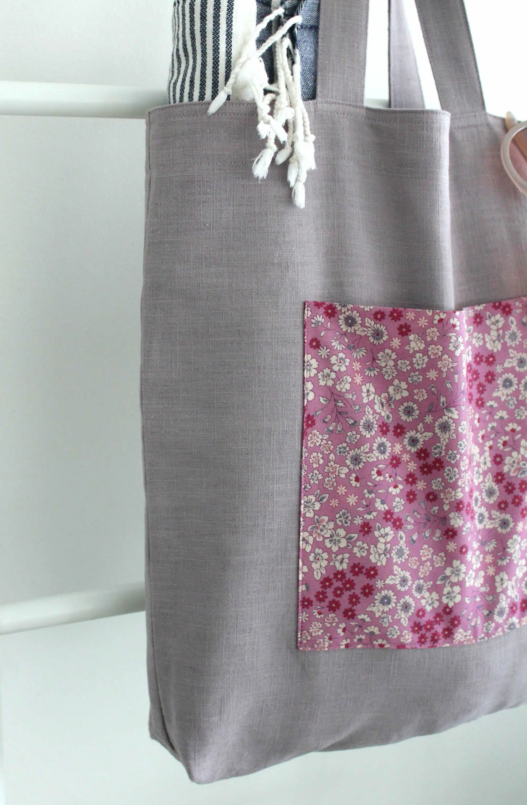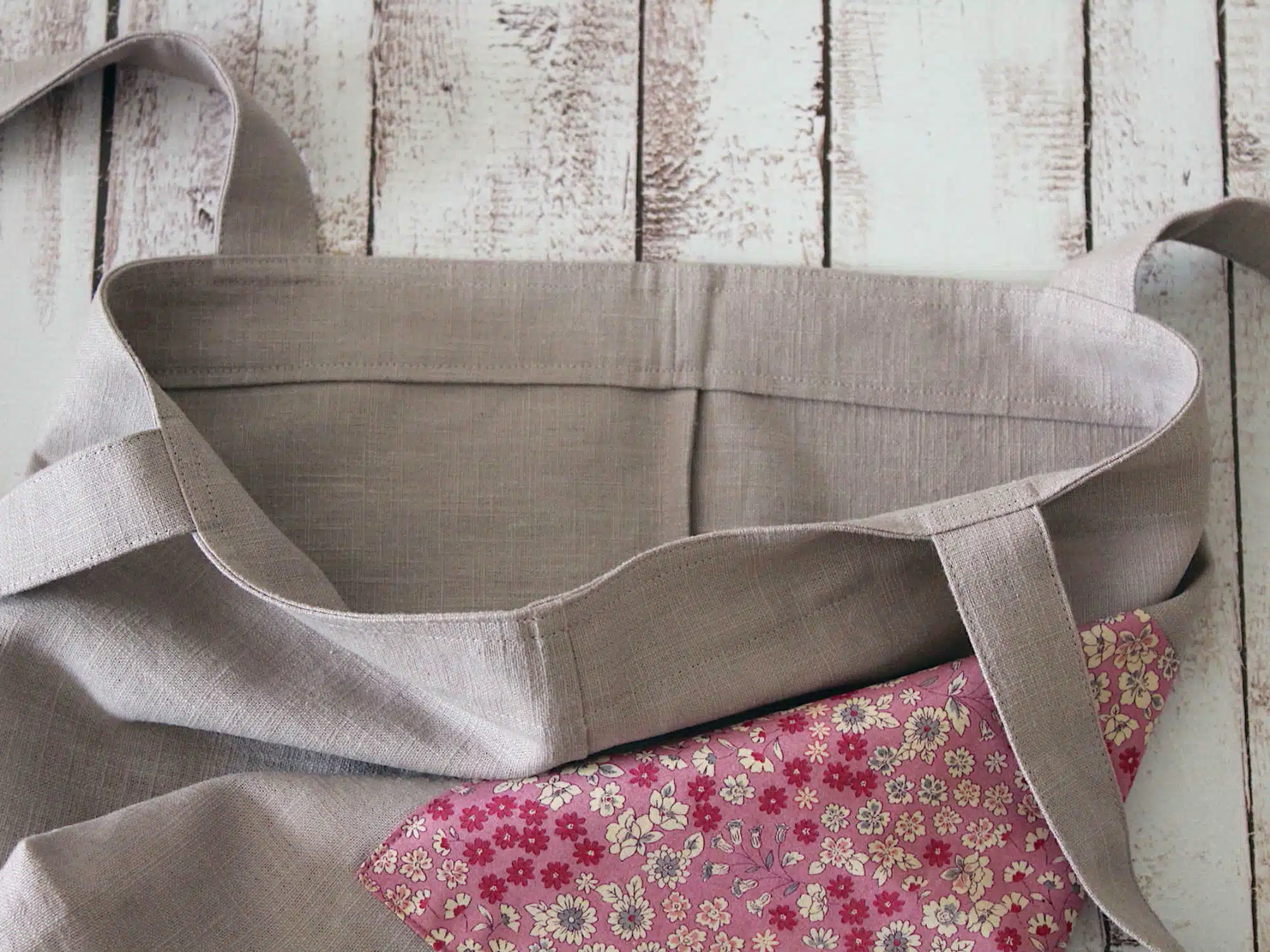 Sac tote en lin vieux rose avec poche extérieure en liberty.