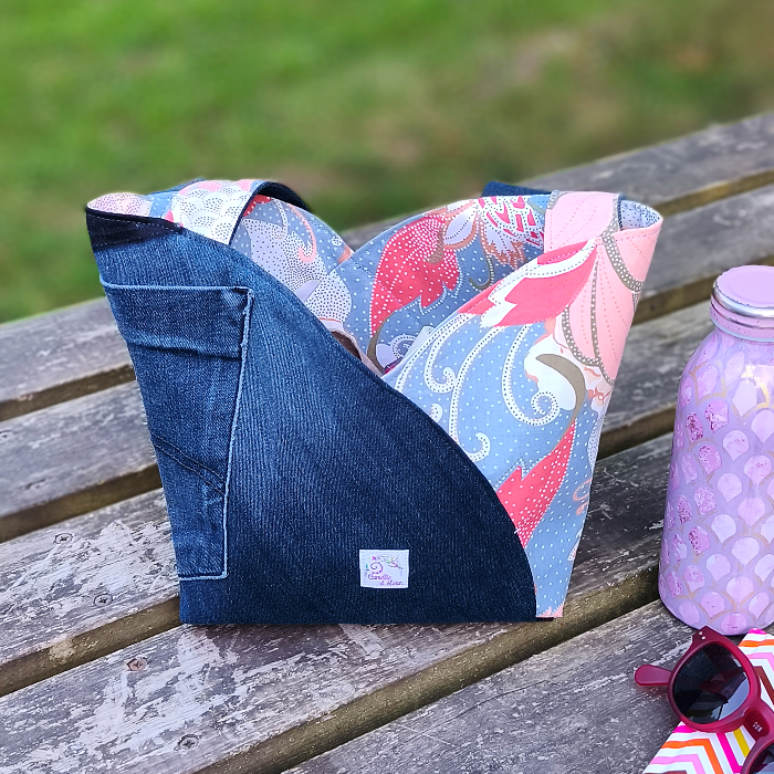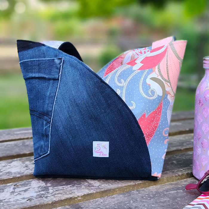 Matières récupérées avec soin : l’extérieur associe un jean trop abîmé pour être réparé et un tissu fleuri resté intact pendant des années dans un grenier. Une jolie manière de réveiller un textile endormi !