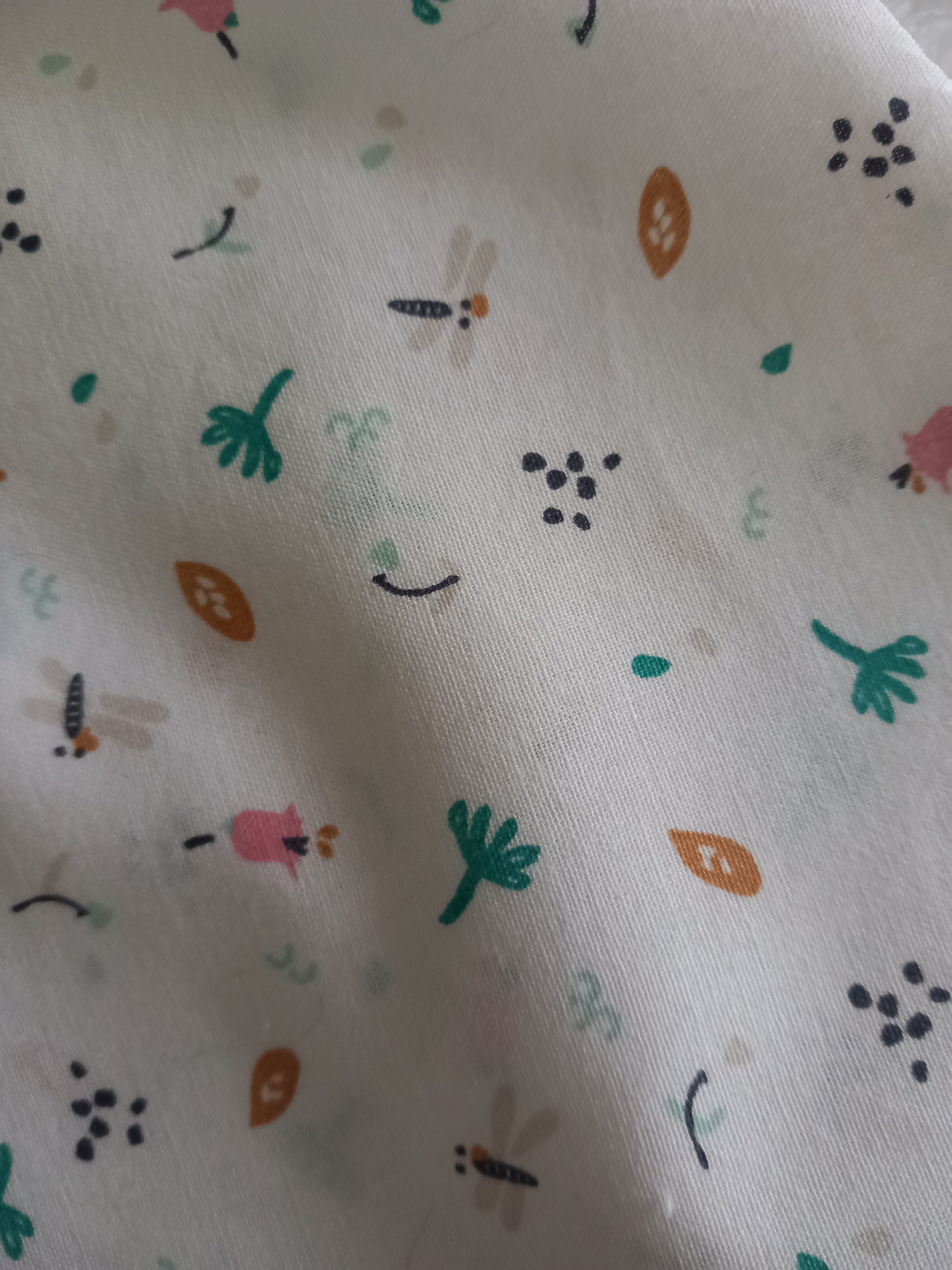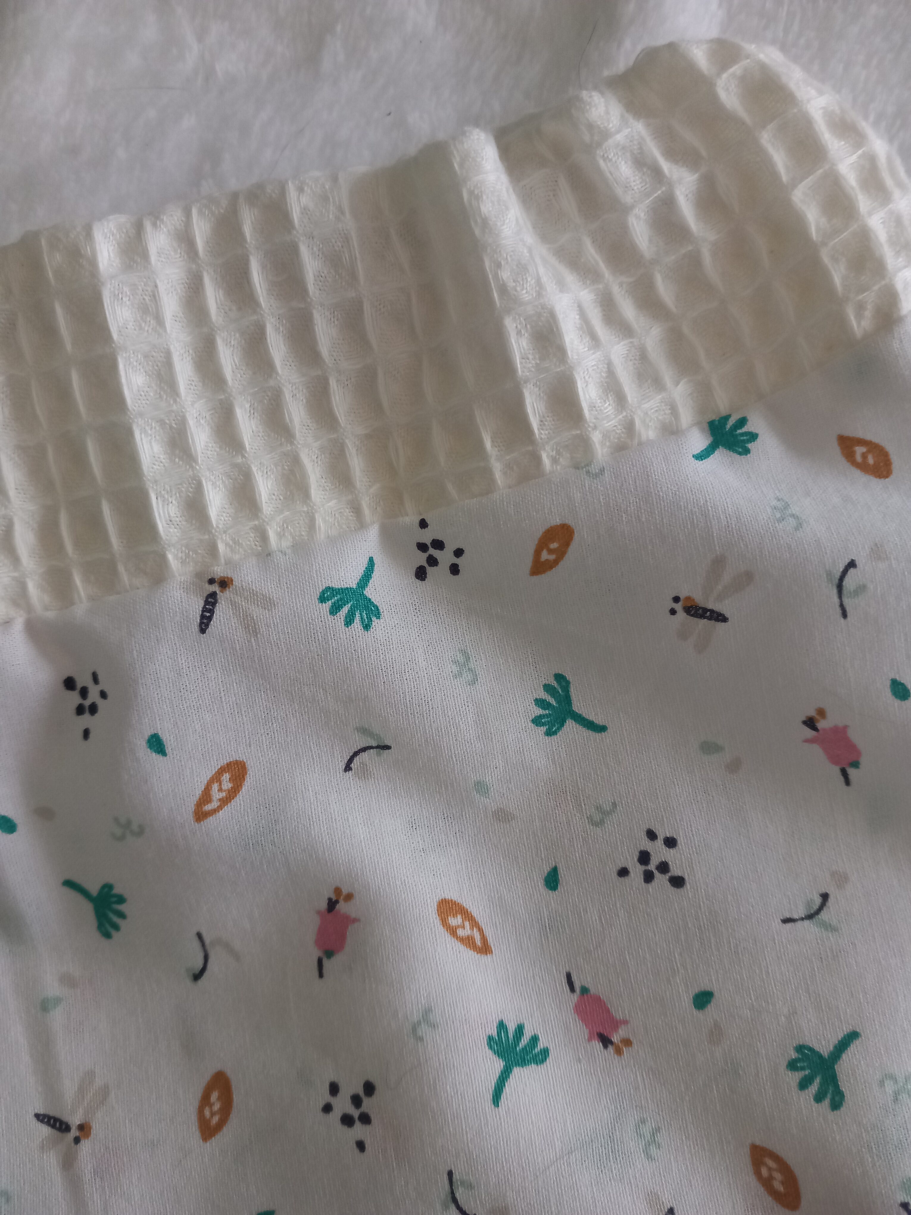 sarouel en coton léger petit motif sur fond blanc ,nid abeille ecru ,élastiqué a la taille