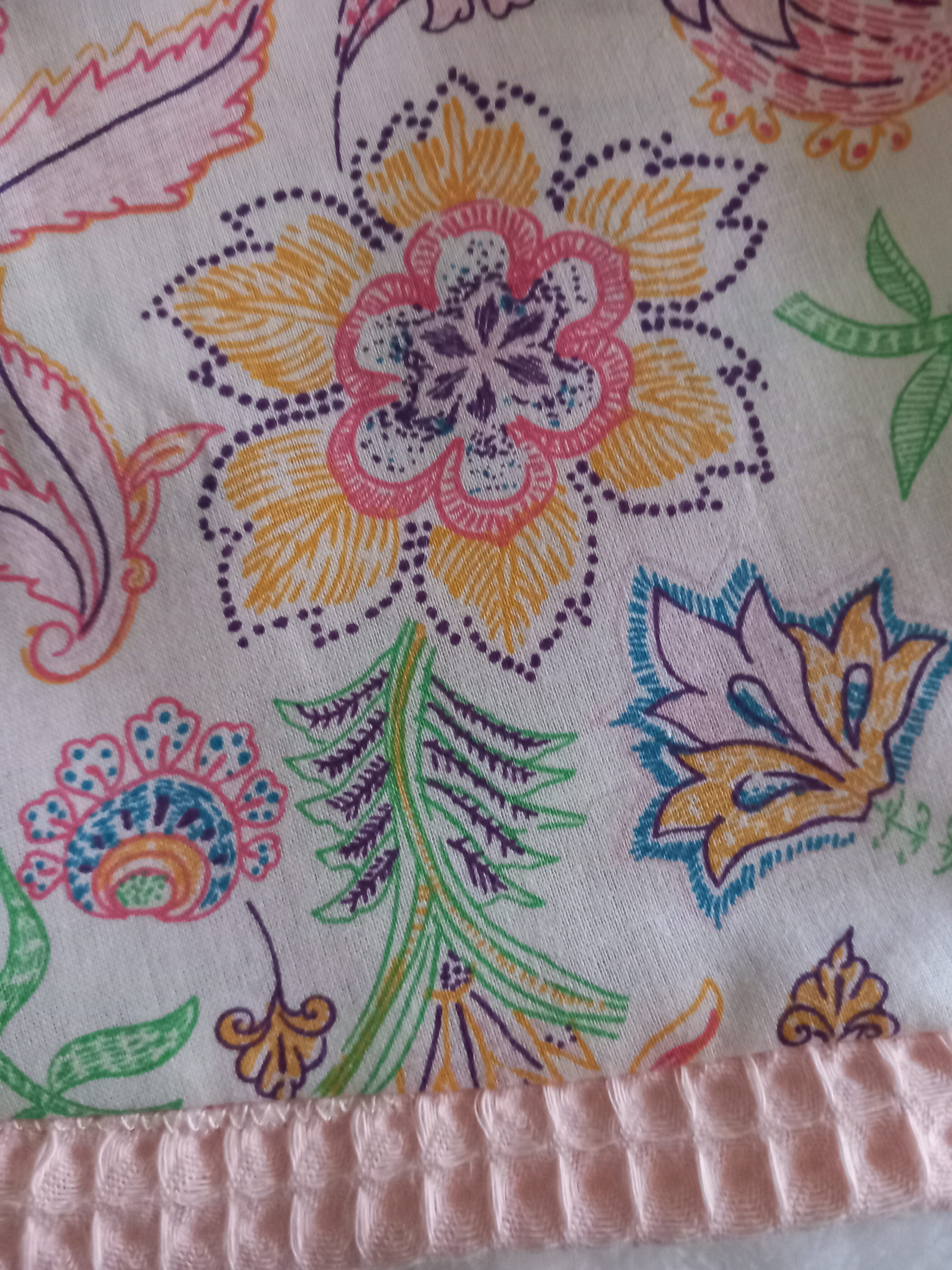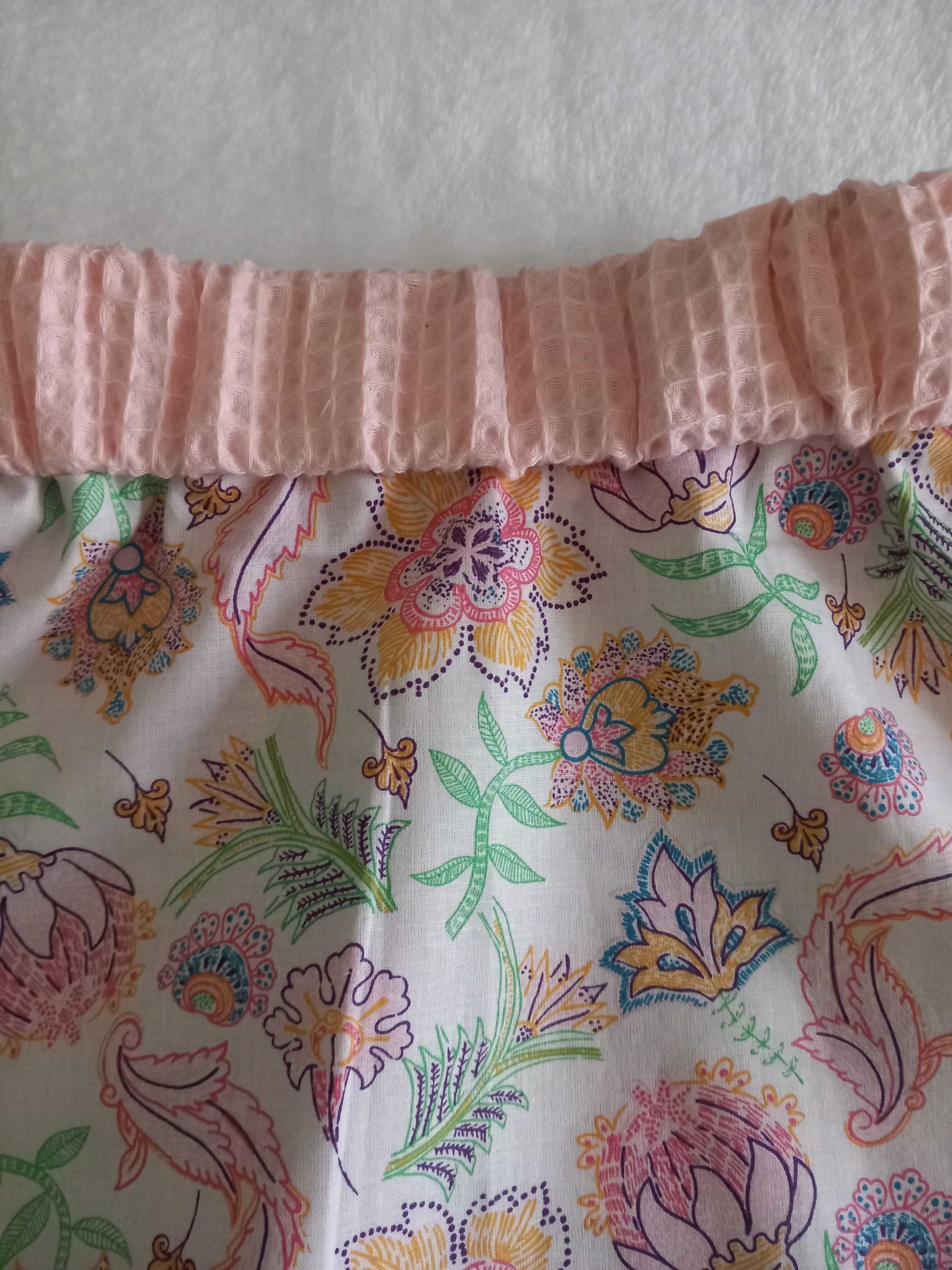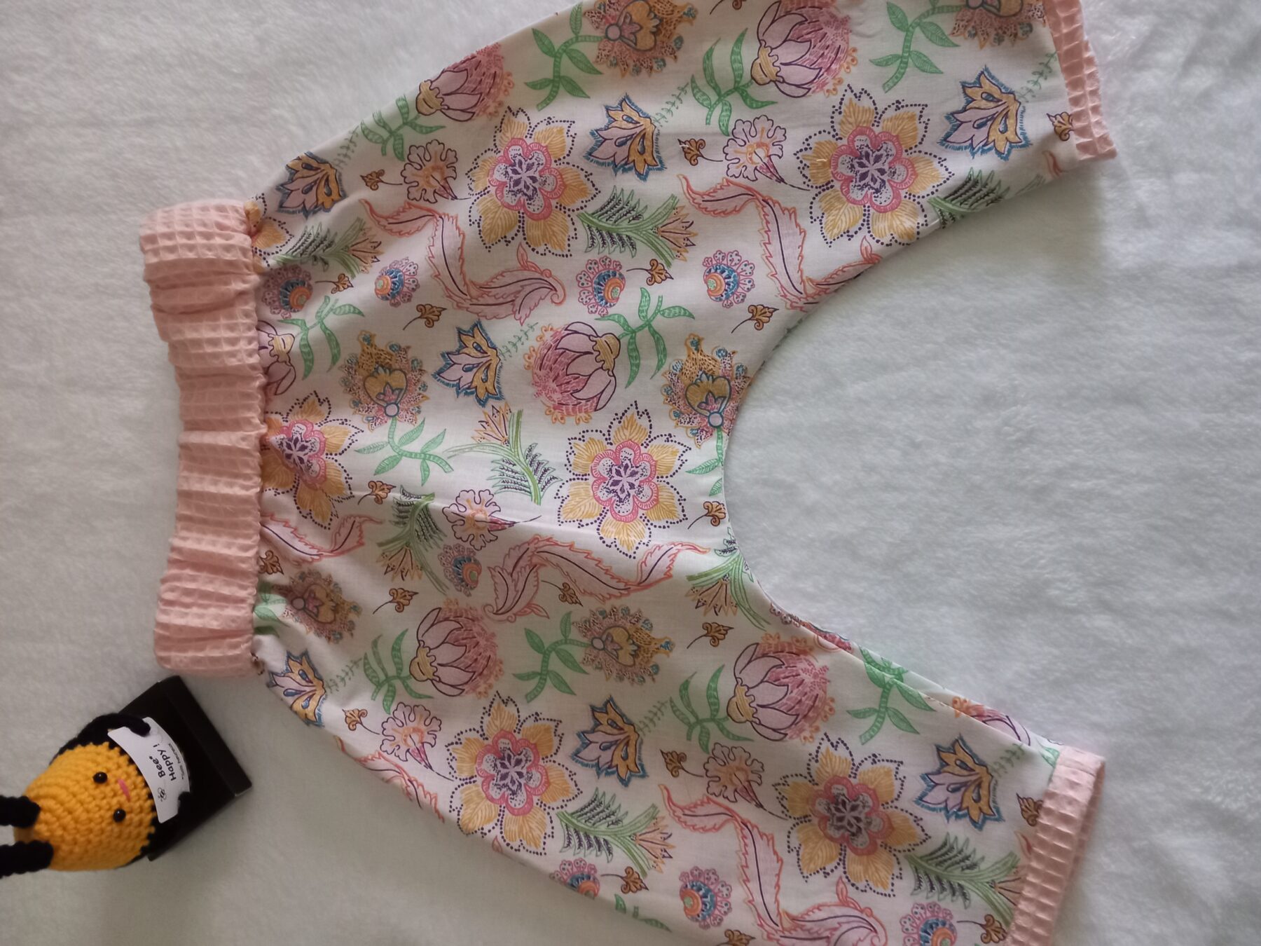 les sarouel est en coton parsemé de petite touche de rose,vert violet orange sur fond blanc ,nid d’abeille rose ,élastique a la taille qui est cousu pour éviter qu’il ne se tord .c’est une taille de 12 mois
