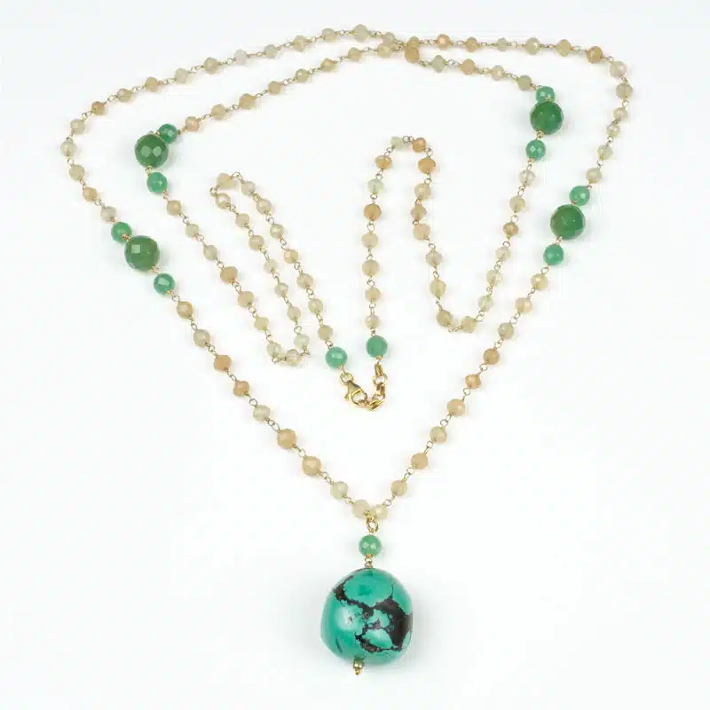 Dans la même lignée que les autres pièces uniques “Gypsy”, ce sautoir se veut plus proche de la nature et plus sobre. C’est pourquoi une large et imposante turquoise s’élance pour évoquer “Mère Nature” et nous permettre de mieux nous ancrer. Il s’agit en quelque sorte d’un rappel à l’essentiel, à ce qui nous entoure et à ce qui compte pour chacun et chacune d’entre nous.