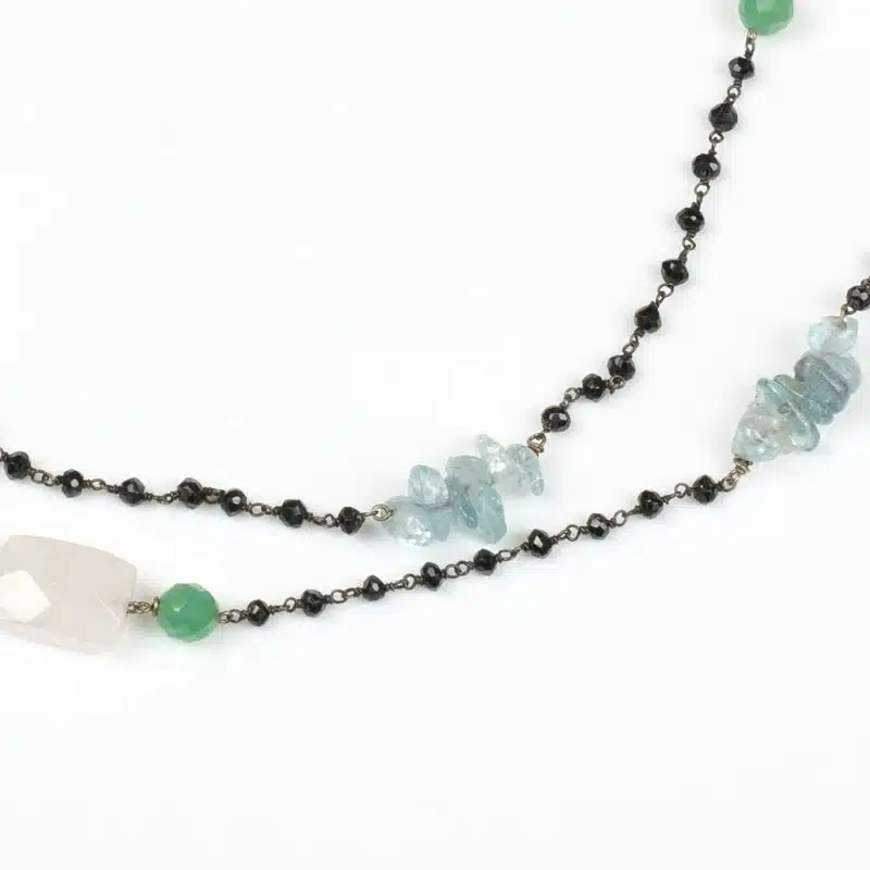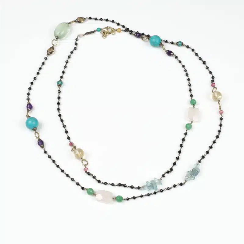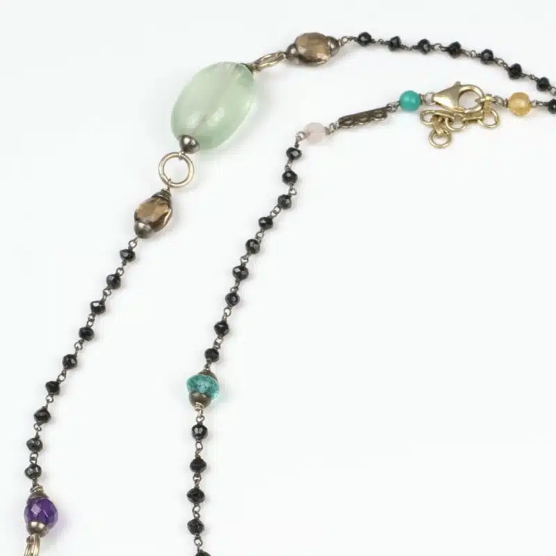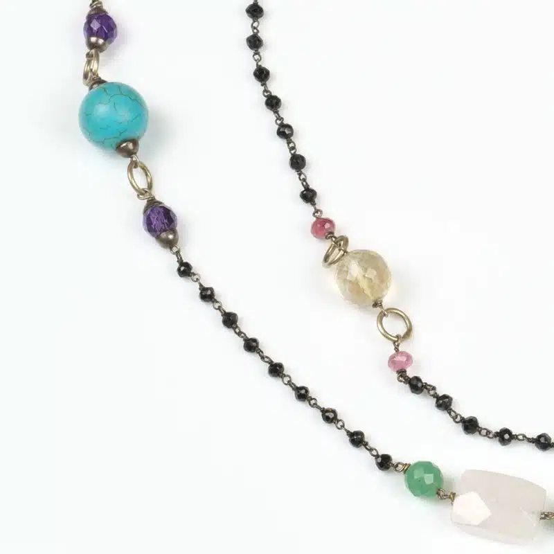 Pièce Unique montée en Argent 925 plaqué Rhodium Noir, Fermoir en Argent 925 plaqué Or et plusieurs liens pour les plus grosses pierres semi-précieuses en Argent 925 pour les sublimer. Ce sautoir a été conçu comme du jazz, sur un fond d’une série de 12 chaînettes composées de 9 Onyx Noir lié en queue de cochon, pour mettre en lumière le reste des pierres : Quartz Rose, Quartz Fumé, Turquoises, Améthystes, Aigues Marines, Jades, Apatites, Citrines, Tourmalines et Fluorite.