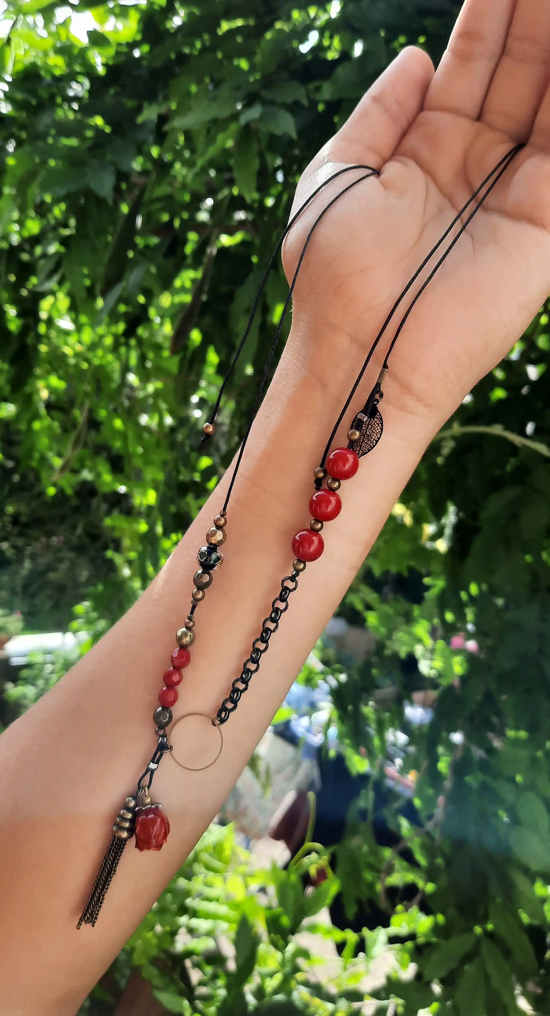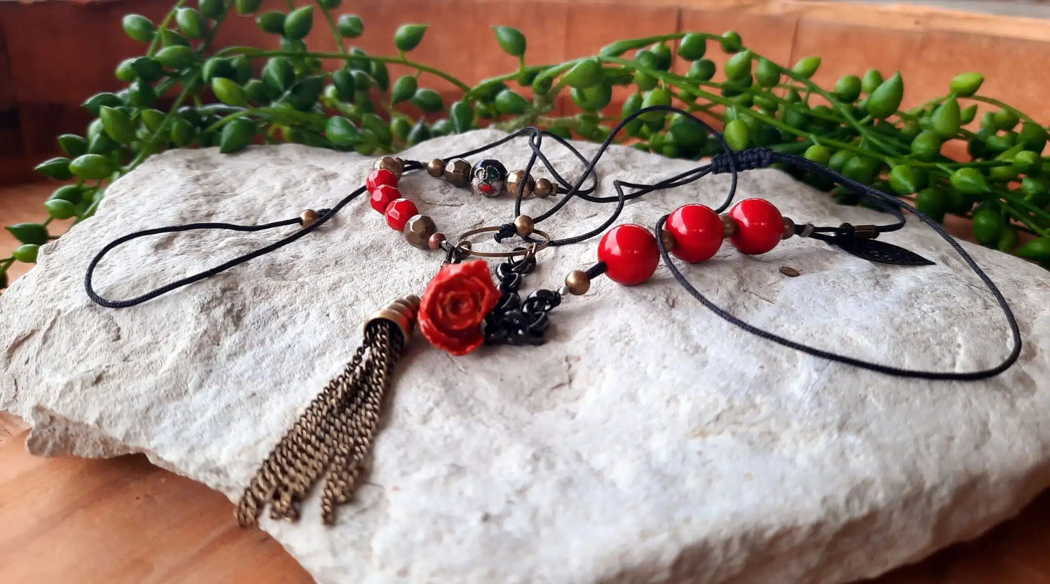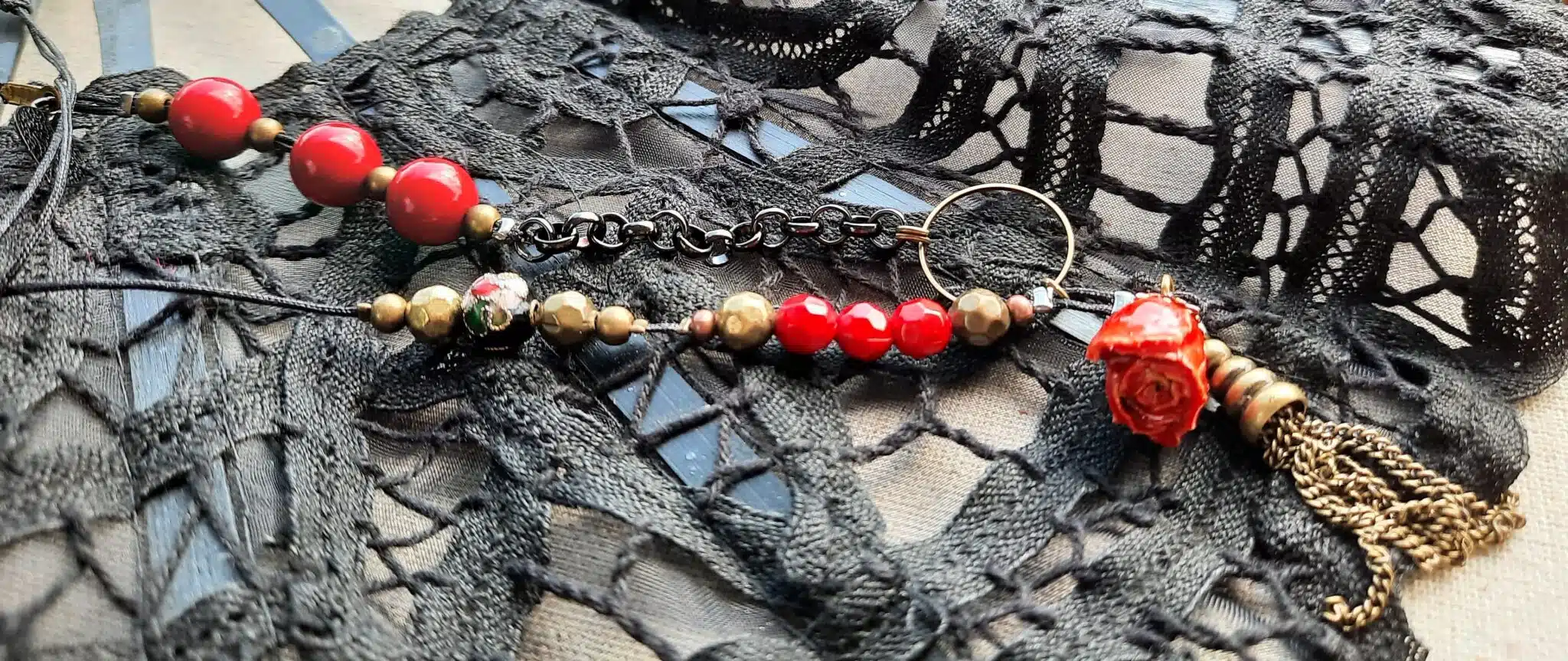 Ce sautoir, au style ancien et moderne à la fois”, se compose avec de perles de verre rouges lisses et facettées, d’une perle noire cloisonnée, de perles rondes en bronze , d’une breloque feuille filigrane noire, d’un pendentif anneau, agrémenté d’un pompon en bronze et de ce petit bouton de rose naturelle séchée et vernie que j’ai chiné.
