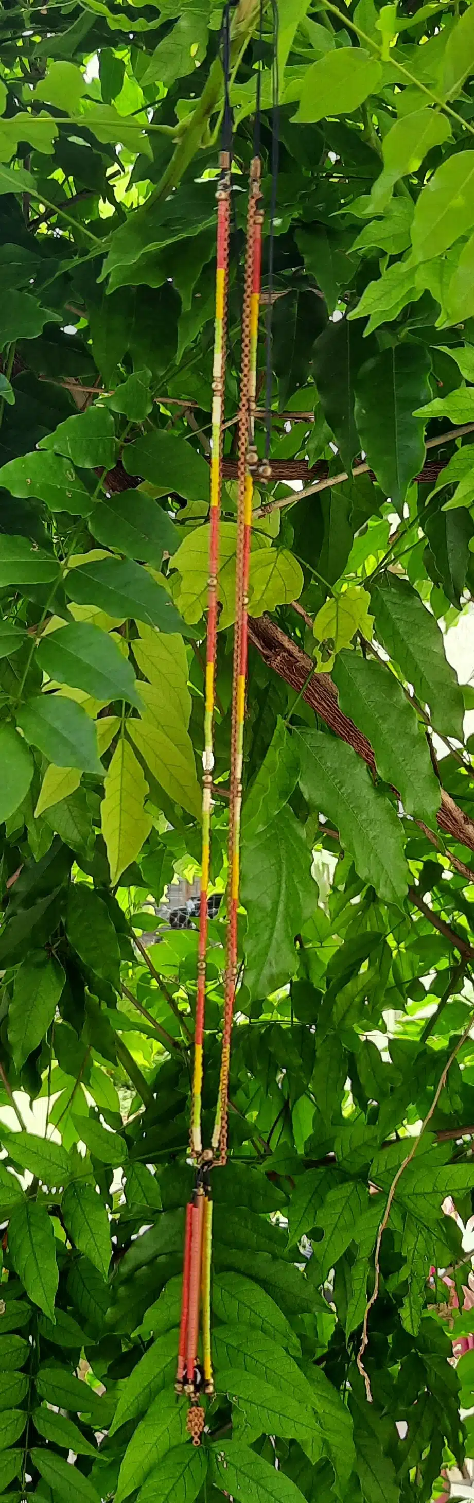 Ce sautoir est fait de deux rangs, une enfilade de perles “Miyuki” et de perles rondes en bronze, sur un fil de soie de 0,5 mn (très résistant) et une chaîne maillons forçat en cuivre.