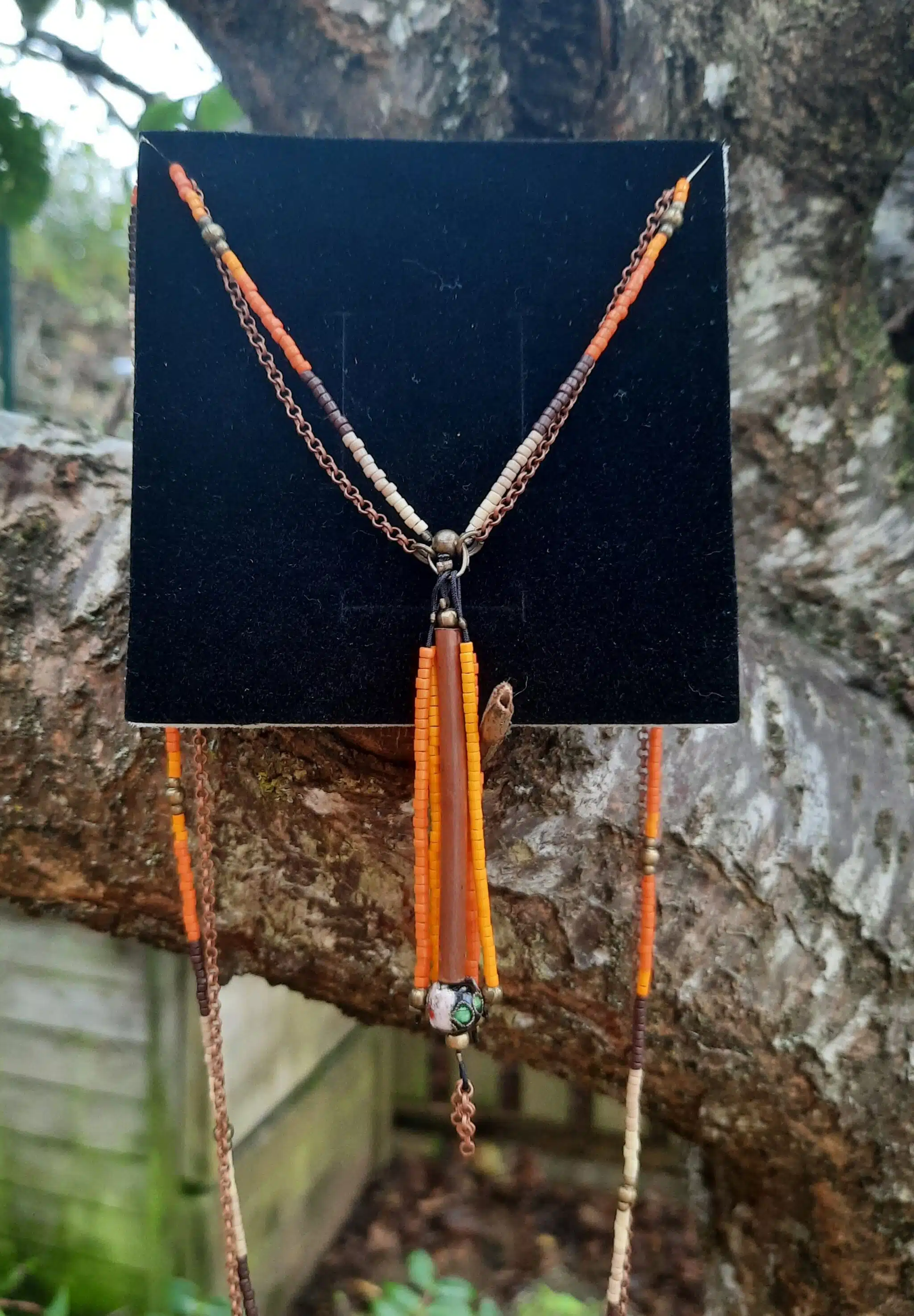 Pour la touche finale, j’ai crée ce pompon unique, avec une breloque faite d’une perle tube en bois, d’une perle cloisonnée en relief et de petites chaînettes en cuivre, puis de quatre fils de perles “Miyuki”