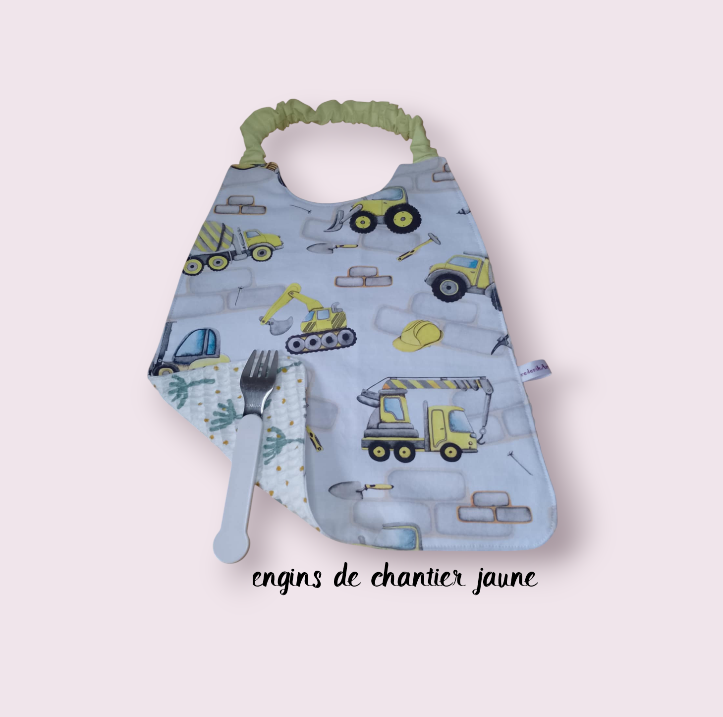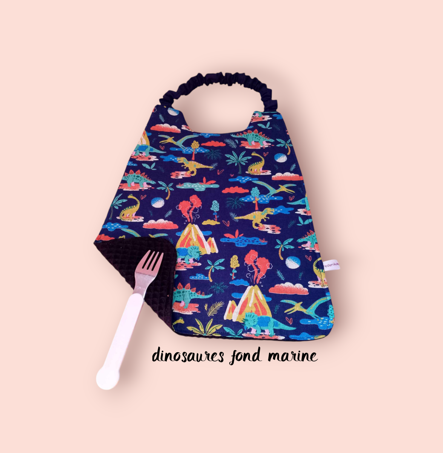 Cette serviette de table élastiquée cousue dans un coton à motifs est doublée d’éponge nid d’abeille de superbe qualité. Elles peuvent s’utiliser des deux cotés, laissant l’enfant décider et l’enfiler seul. Très pratique notamment pour l’école, la maison, chez la nounou ou chez mamie ou papy.