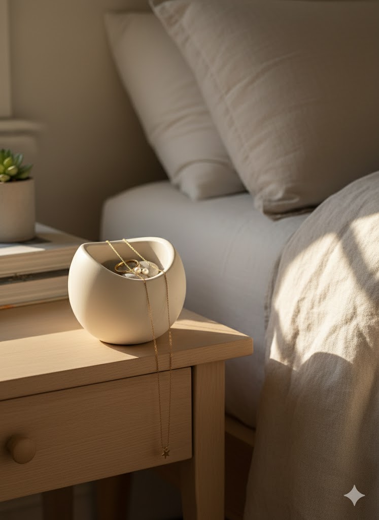 vos bagues, boucles d’oreilles ou petits colliers sur votre table de