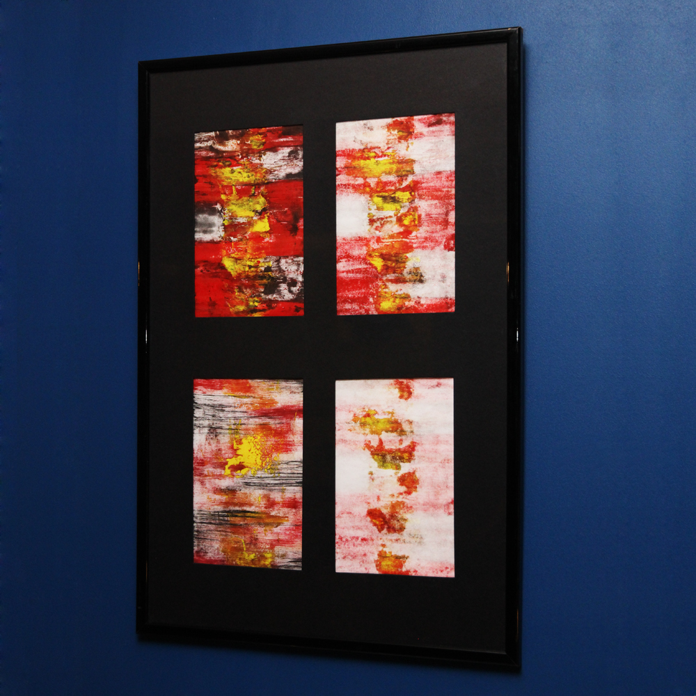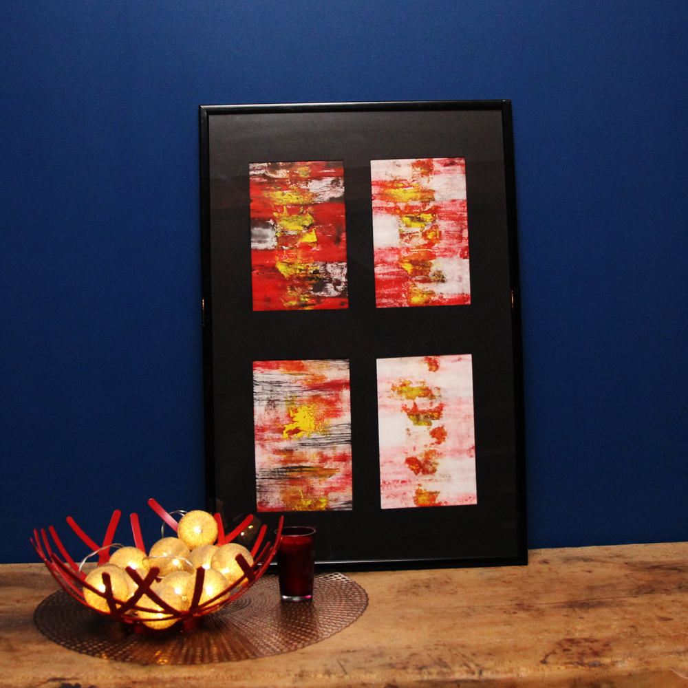 Œuvre réalisée à partir de la technique traditionnelle de la Composition graphique mise en cadre en verre, contour noir laqué. A