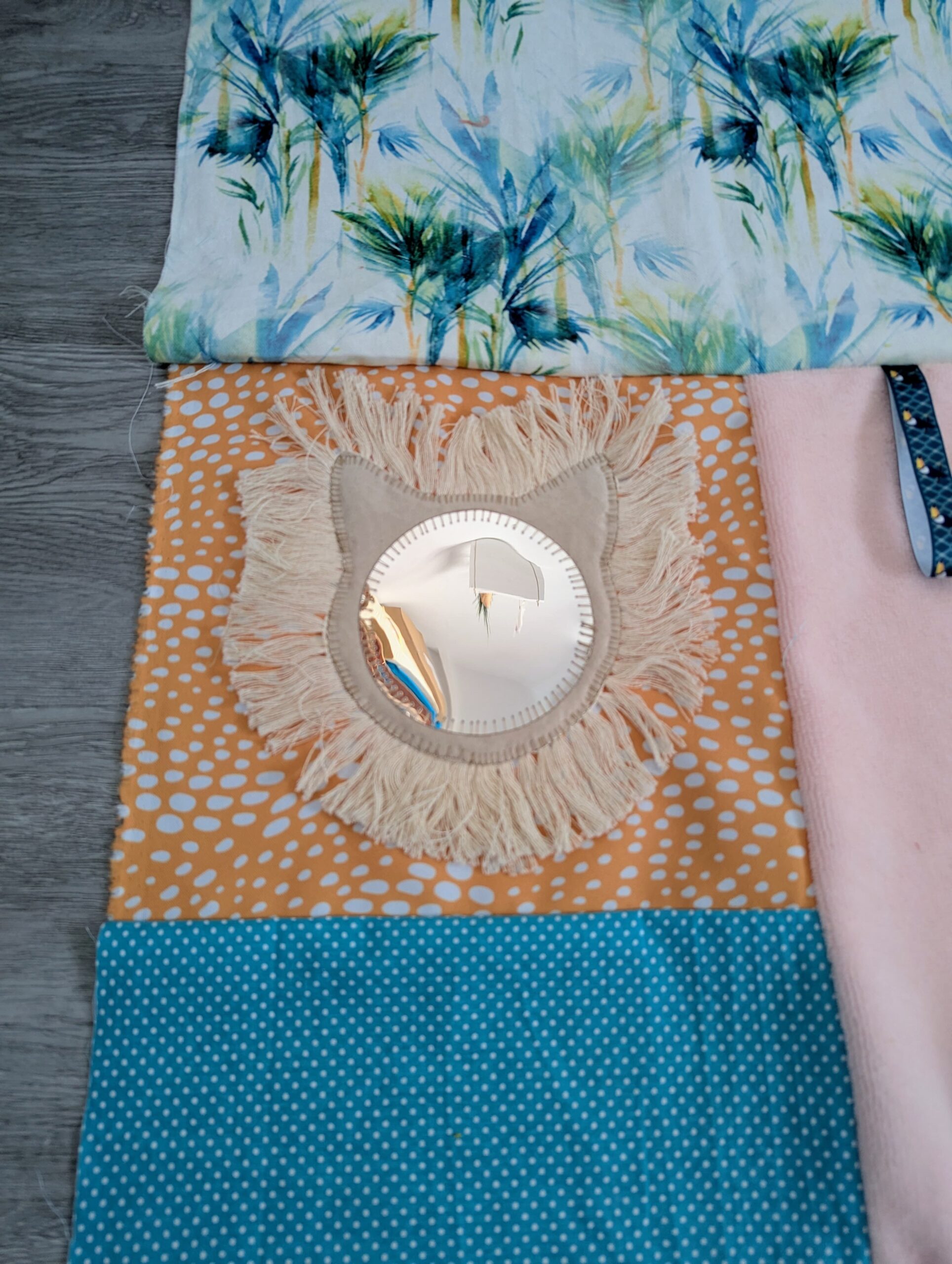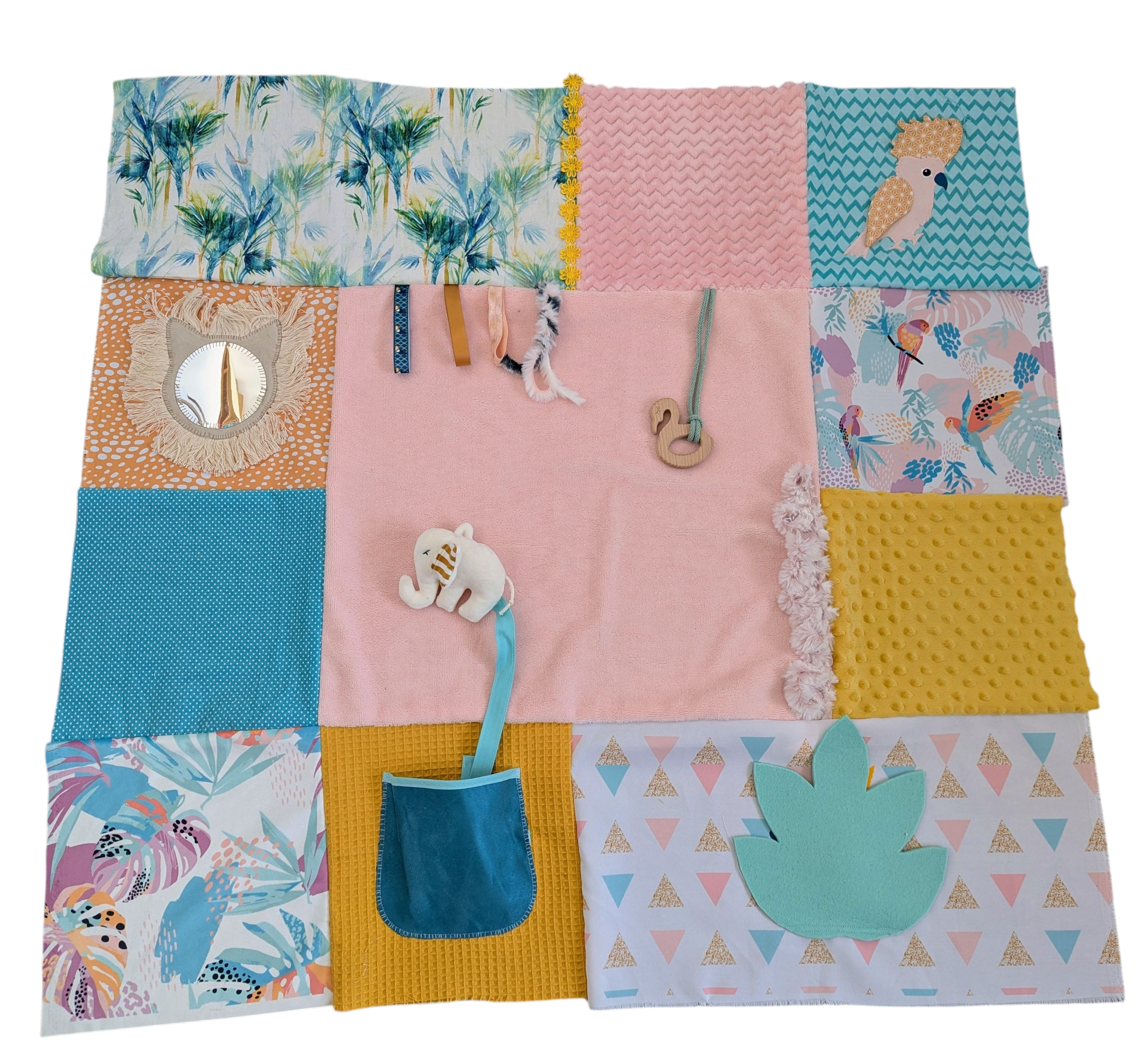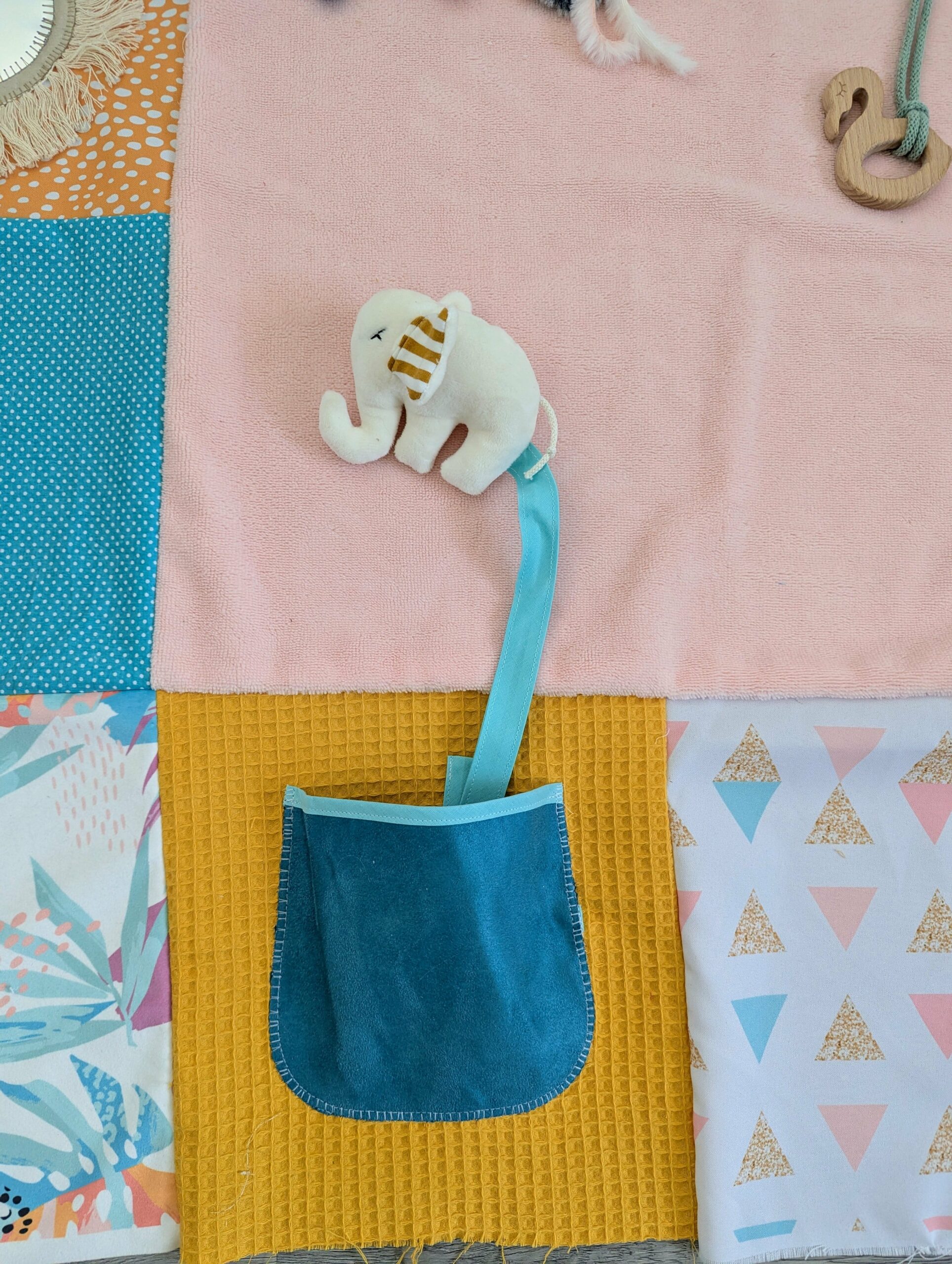 Afin de garantir la sécurité des enfants qui est primordiale, la conception (sécurité, longueur de cordon et solidité) ainsi que le choix des matières respectent les directives et normes européennes. De plus, j’ai pris soin de coudre soigneusement tous les éléments du tapis d’éveil et ai soumis mes créations aux mains parfois peu délicates de mes filles pour leur plus grand bonheur.