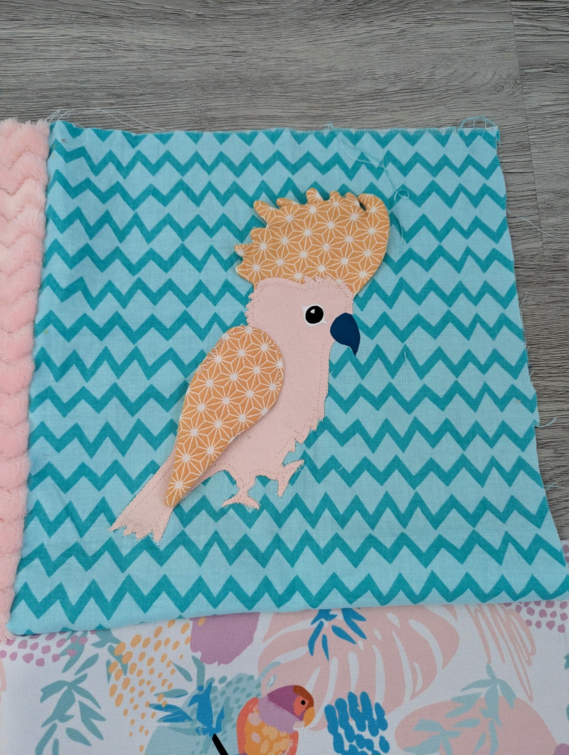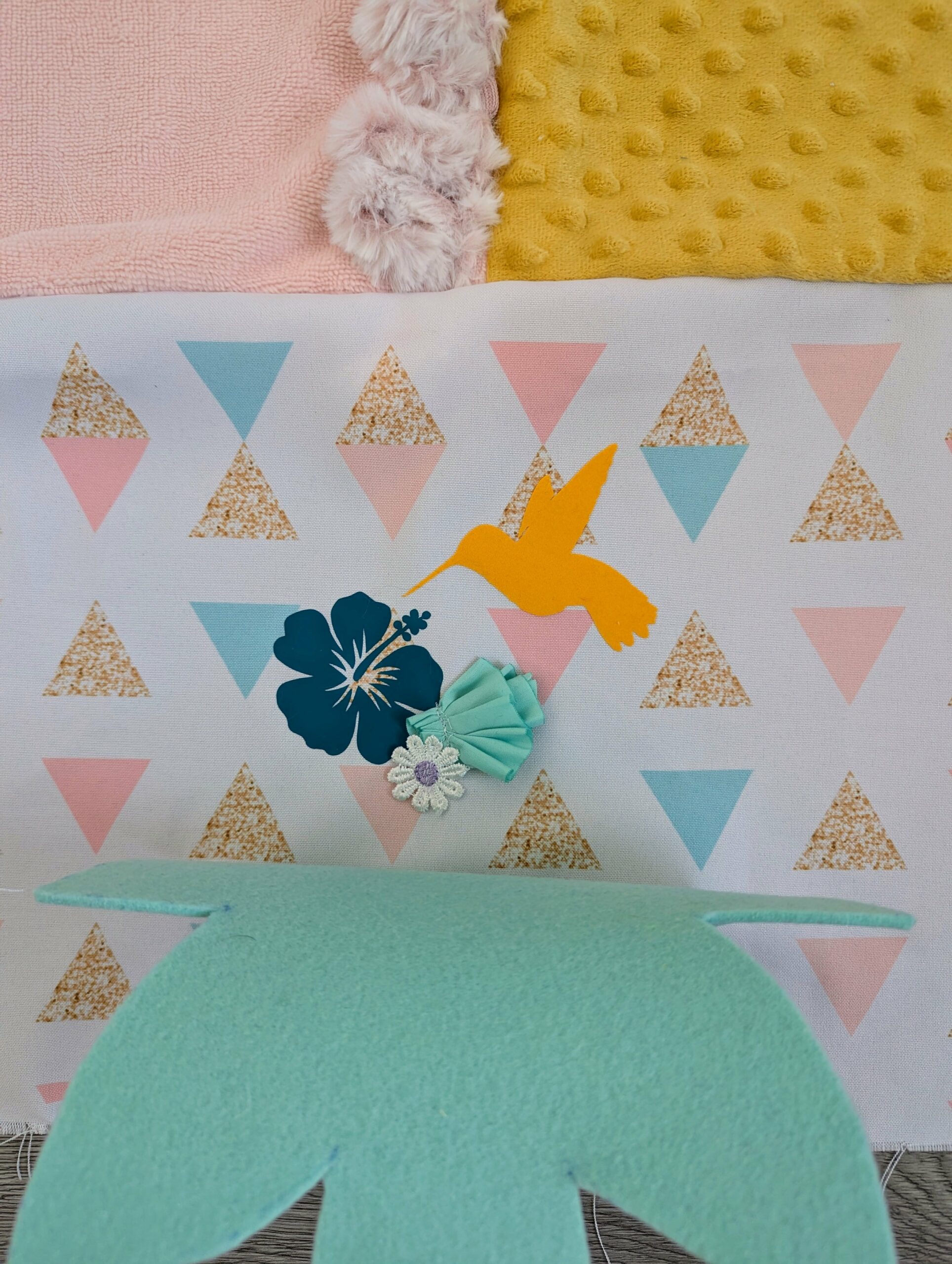 Les coloris de ce tapis sont: turquoise, menthe, jaune moutarde, écru, rose … Un mix entre des imprimés sur le thème, des tissus texturés, unis ou graphique.