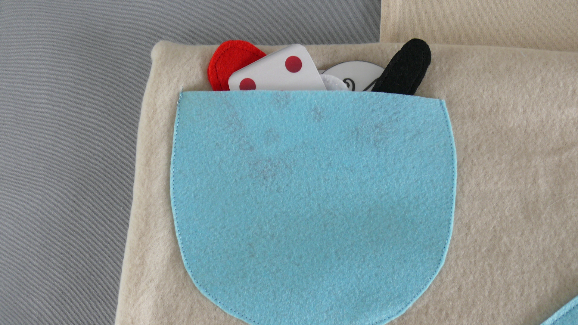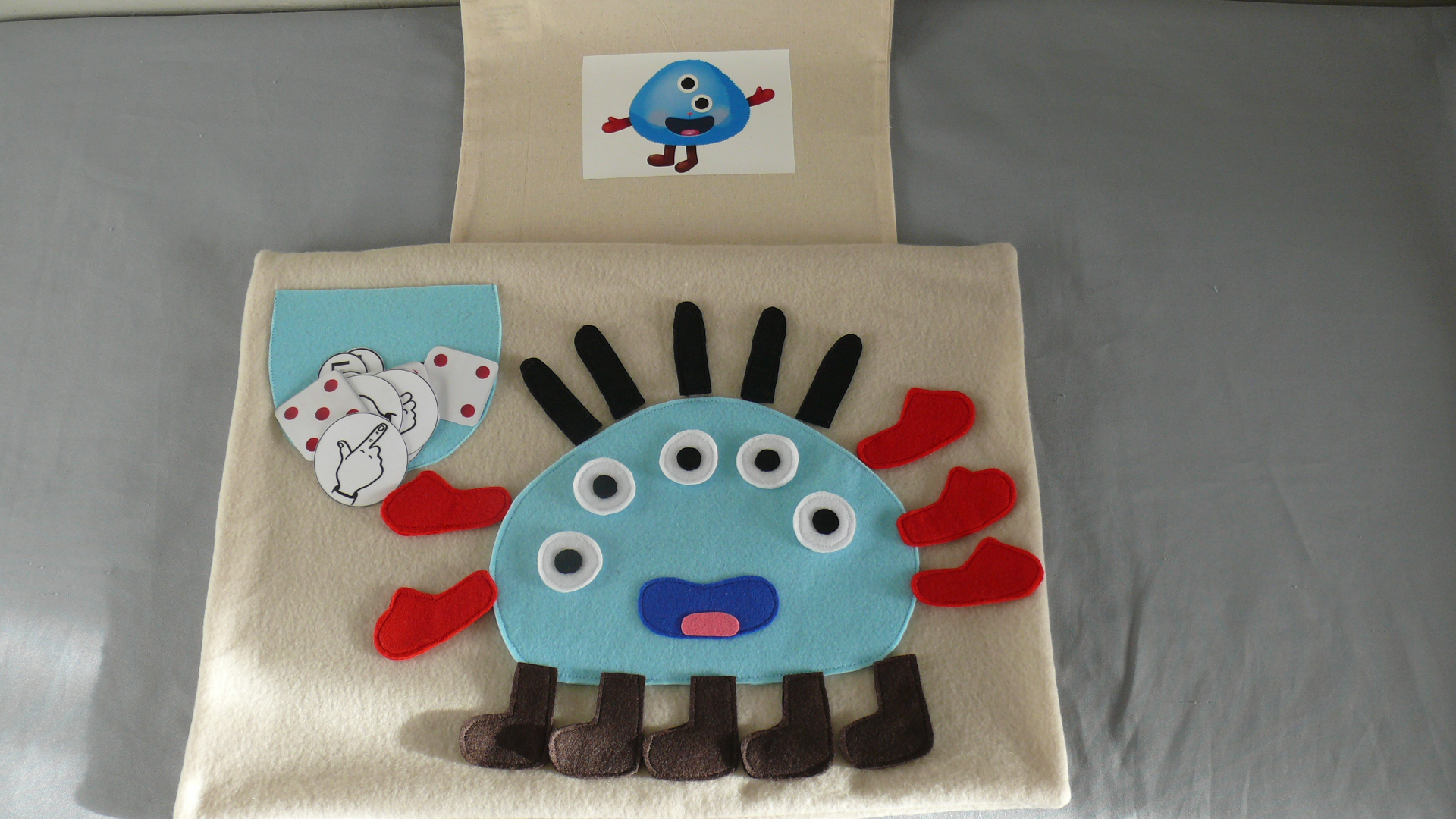 – 1 tapis en tissu polaire mesurant 48/36 sur lequel se scratche le monstre qui mesure 24/17 cm, le tapis possède une poche pour ranger tous les petits éléments (en feutrine et plastifiés)