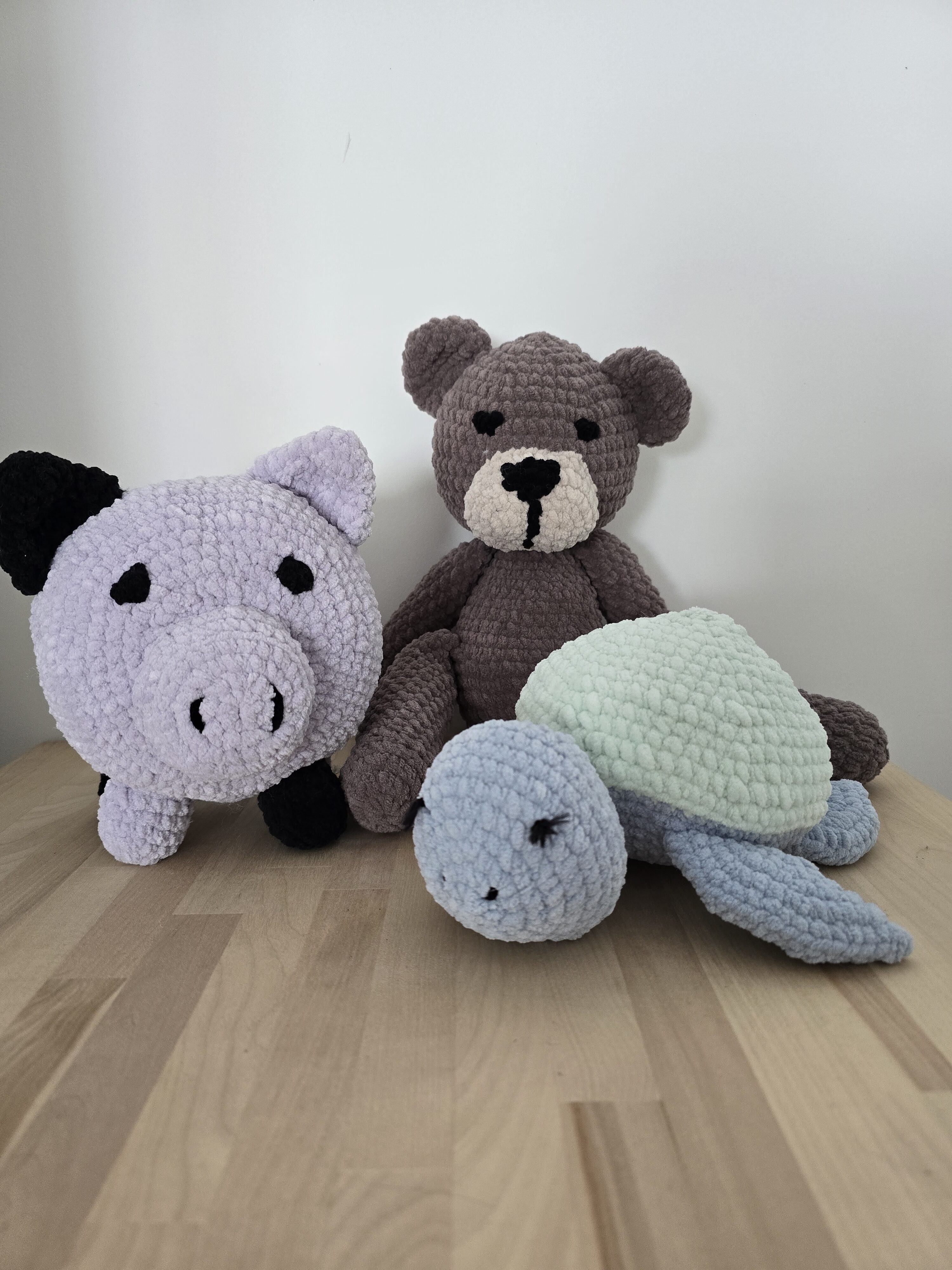 Peluche cochon, peluche ours ou peluche tortue en crochet, entièrement confectionnés à la main à partir d’une laine d’une très grande douceur.