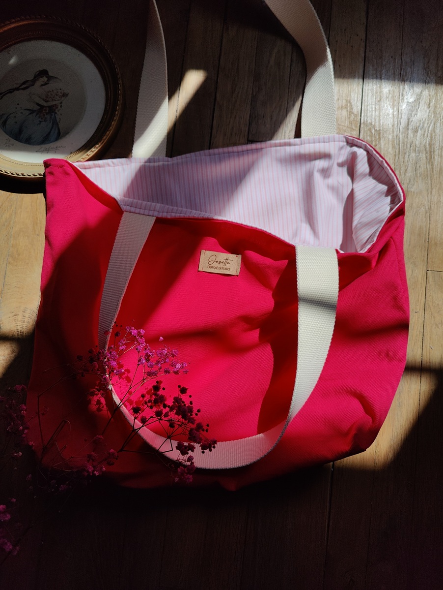 Imaginez un sac qui s’adapte à toutes vos envies. D’un côté, un tissu rayé blanc et rose, doux et élégant, idéal pour les journées printanières ou les balades en ville. De l’autre, un magnifique fuchsia, qui apporte une touche d’énergie à vos tenues. Ce tote bag réversible est bien plus qu’un simple sac : c’est deux accessoires en un, conçus pour durer.