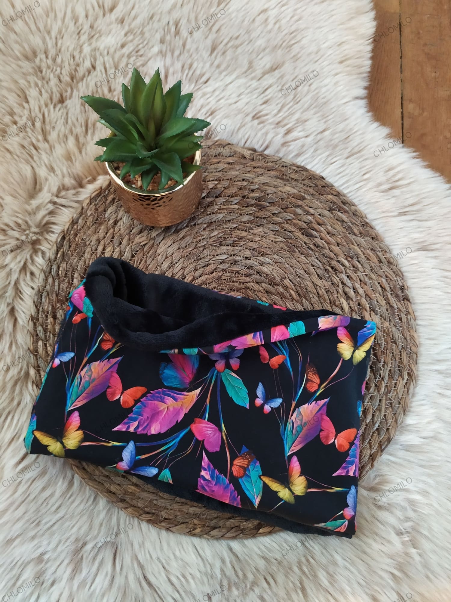 Tour de cou motif papillons multicolores fond noir