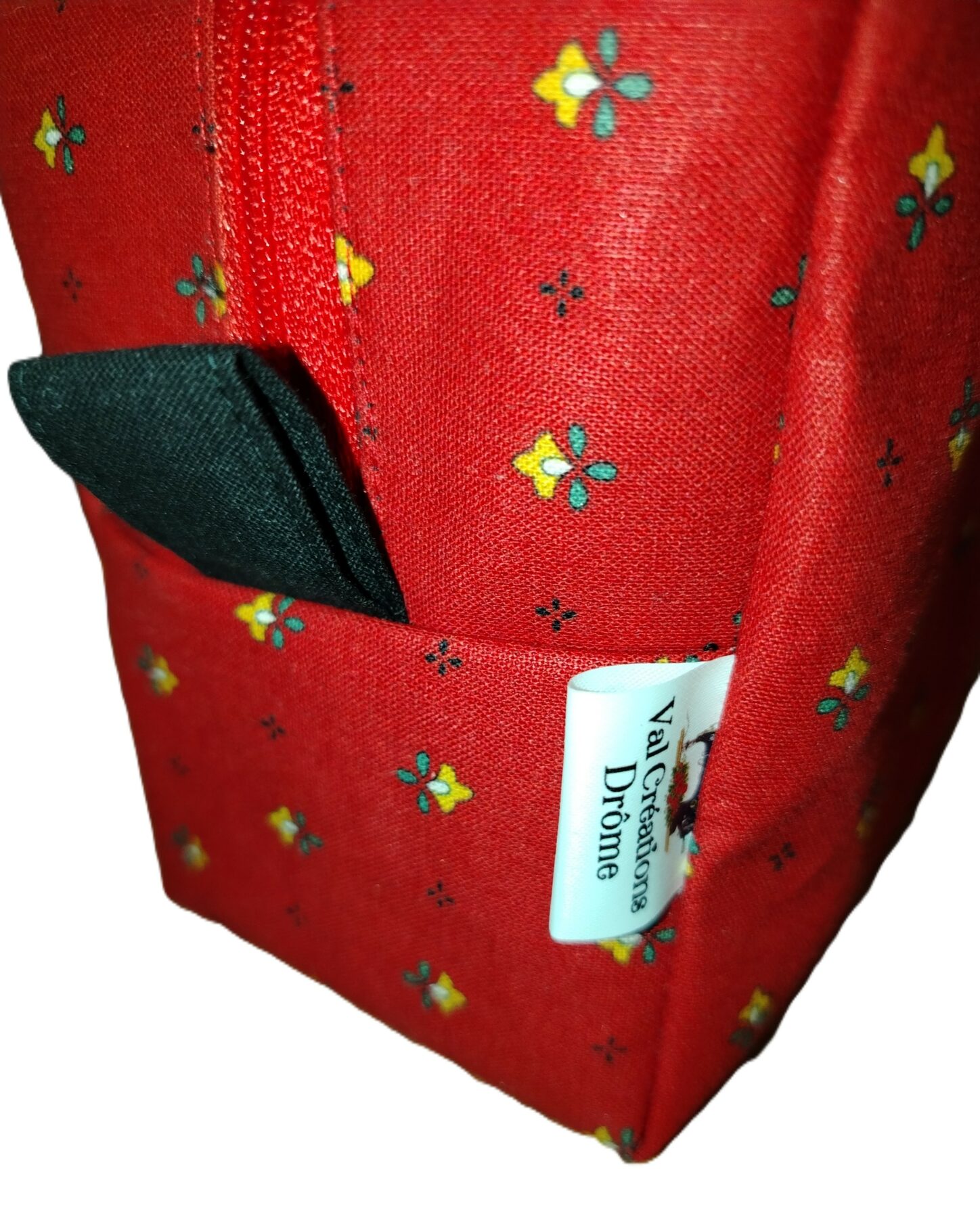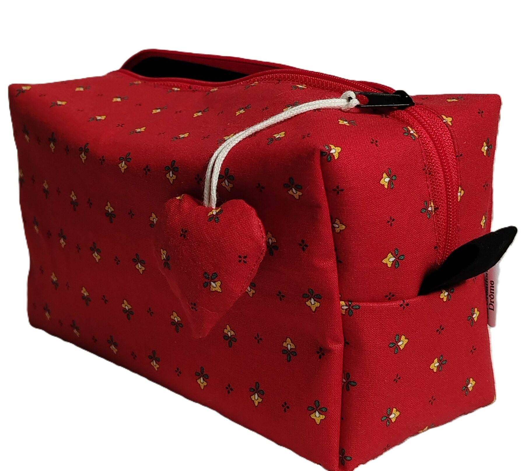 Adoptez cette jolie trousse de toilette en tissu rouge provençal à petits motifs floraux jaune et vert ou arlésiennes, dispose d’une fermeture à glissière rouge sur le dessus avec un charm en forme de cœur assorti et une petite étiquette “Val Créations Drôme” sur le côté, ma marque de fabrication.