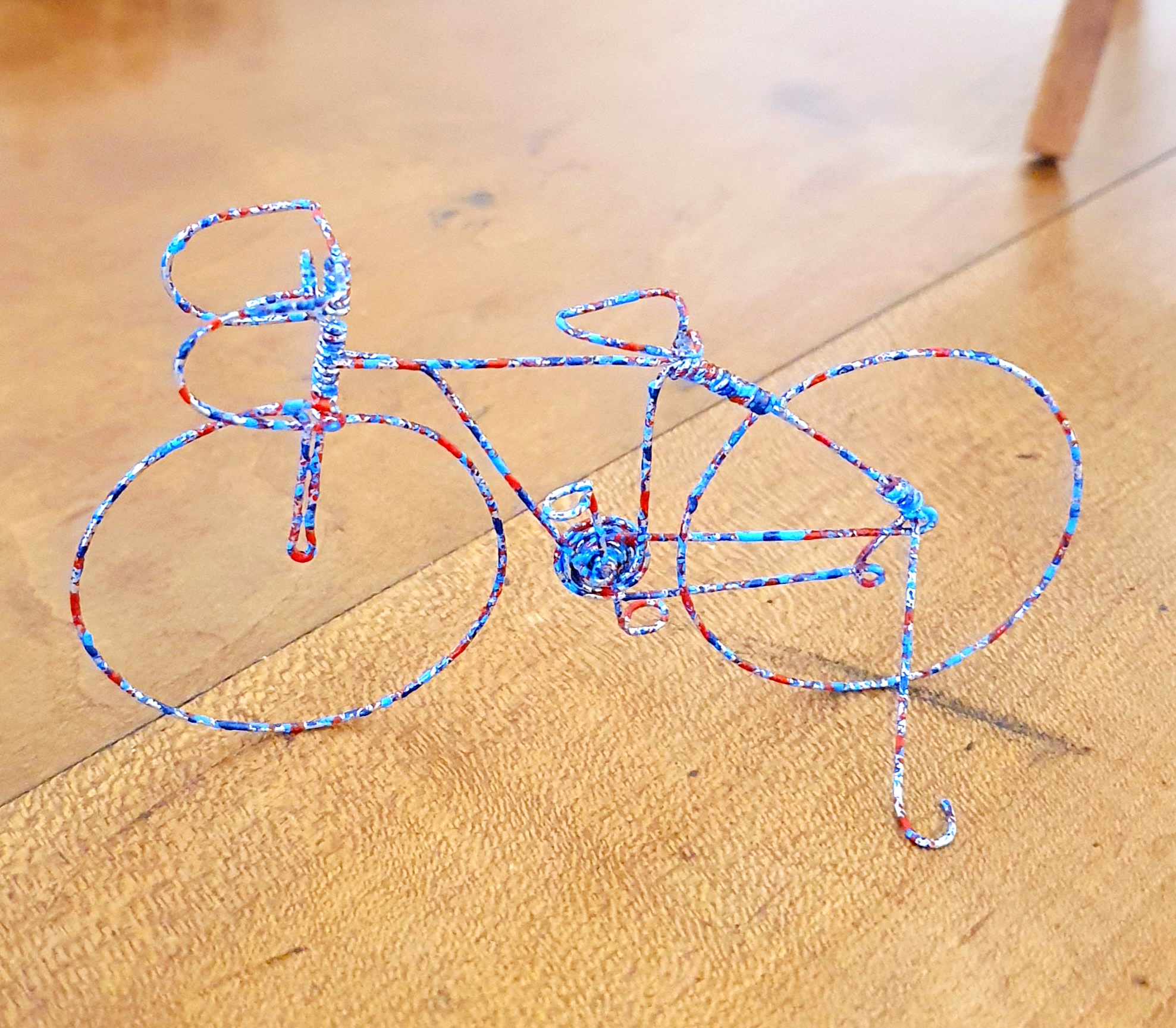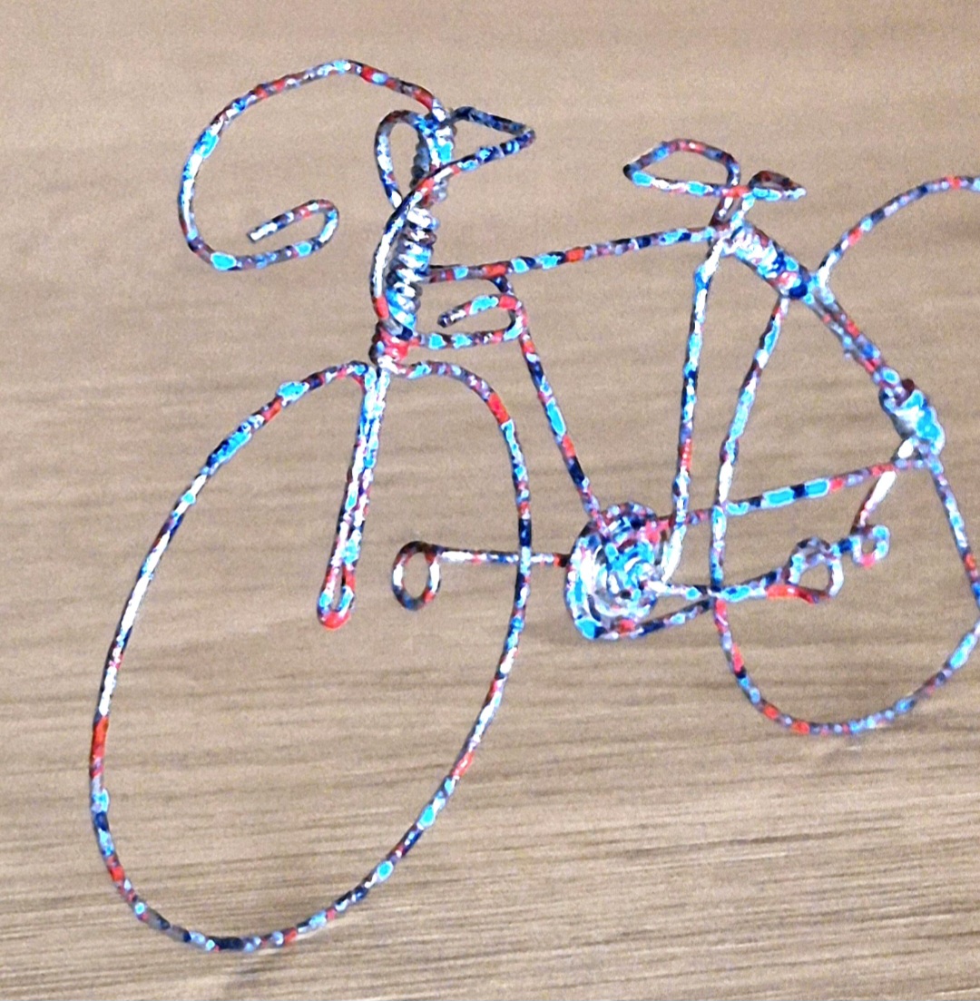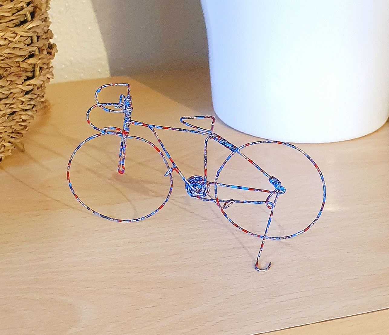 Ce joli petit vélo est entièrement réalisé à la main en fil de fer. Pour le créer, j’utilise une technique de pliage et m’aide de différentes pinces. Il est peint à l’acrylique.