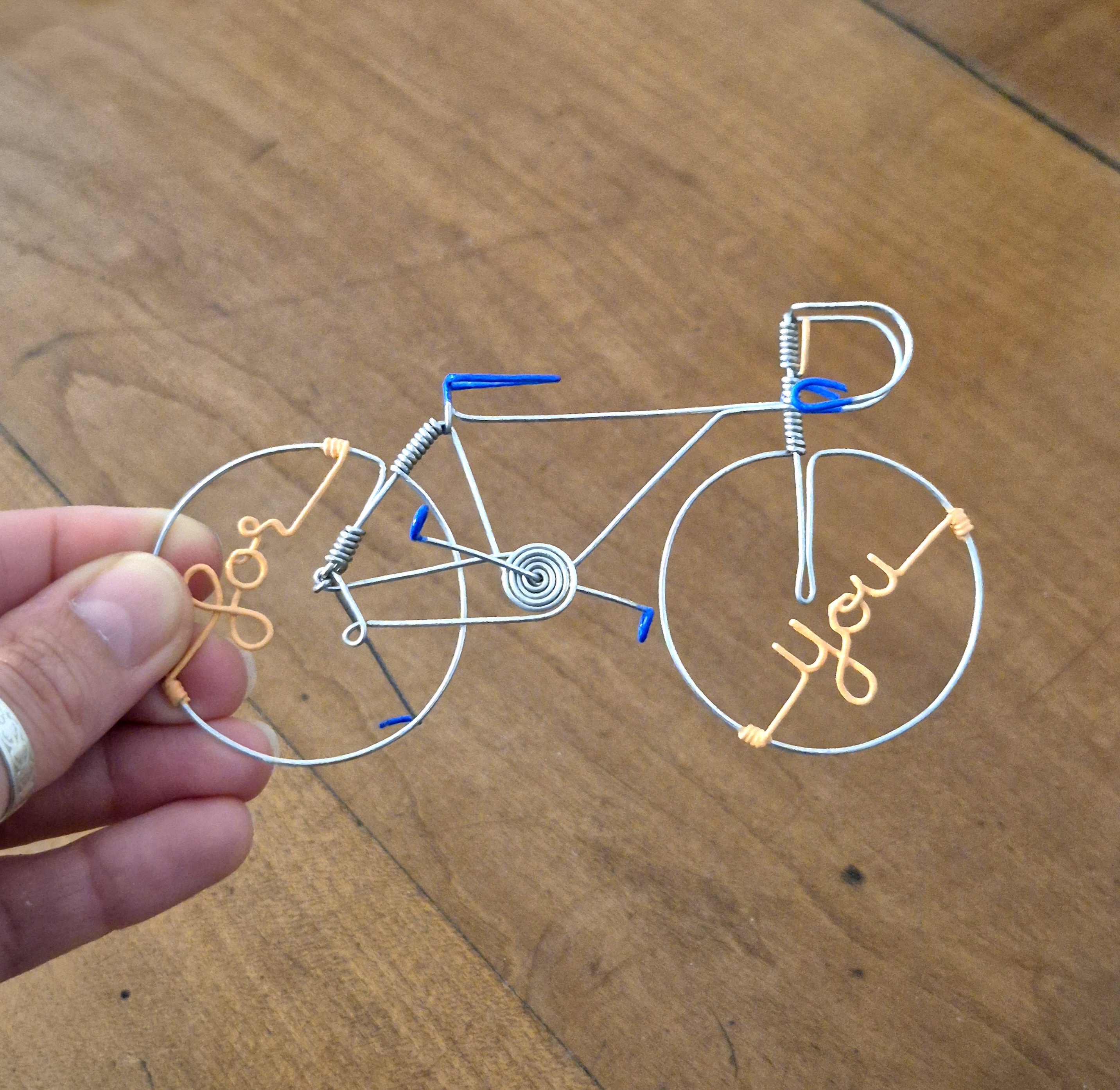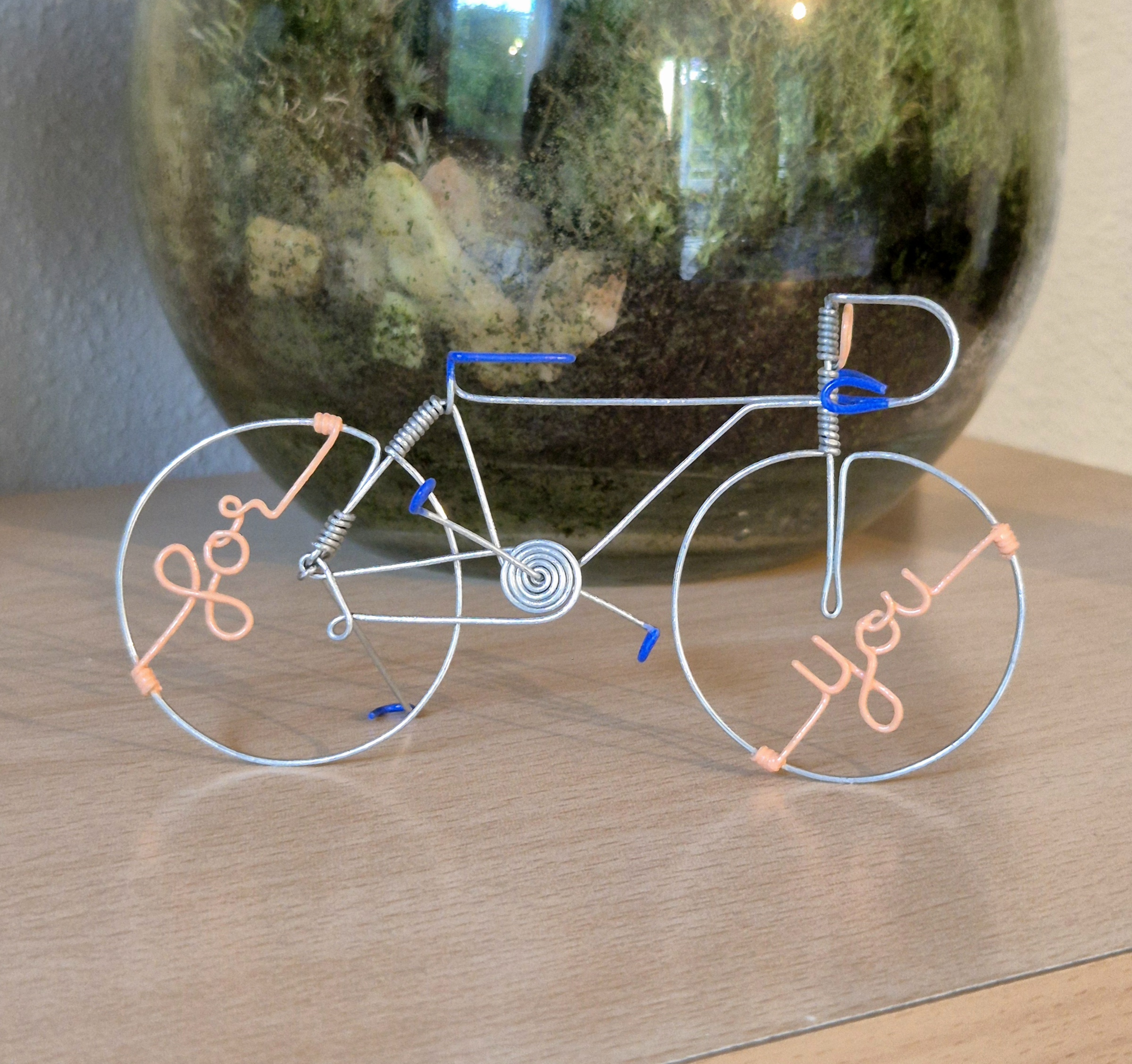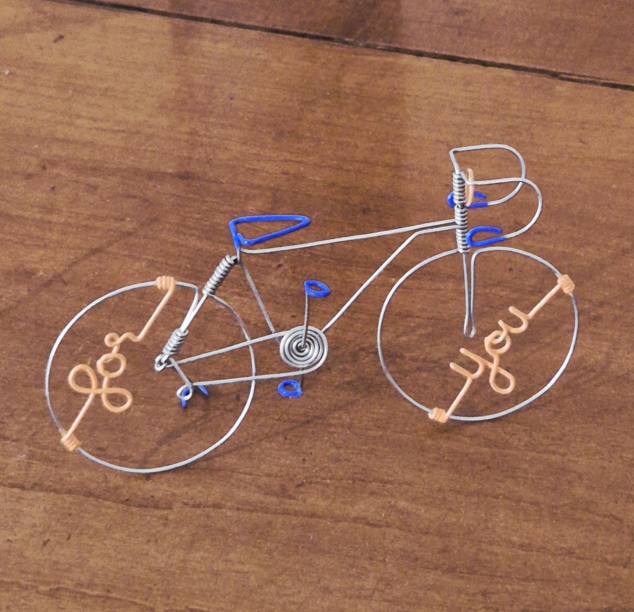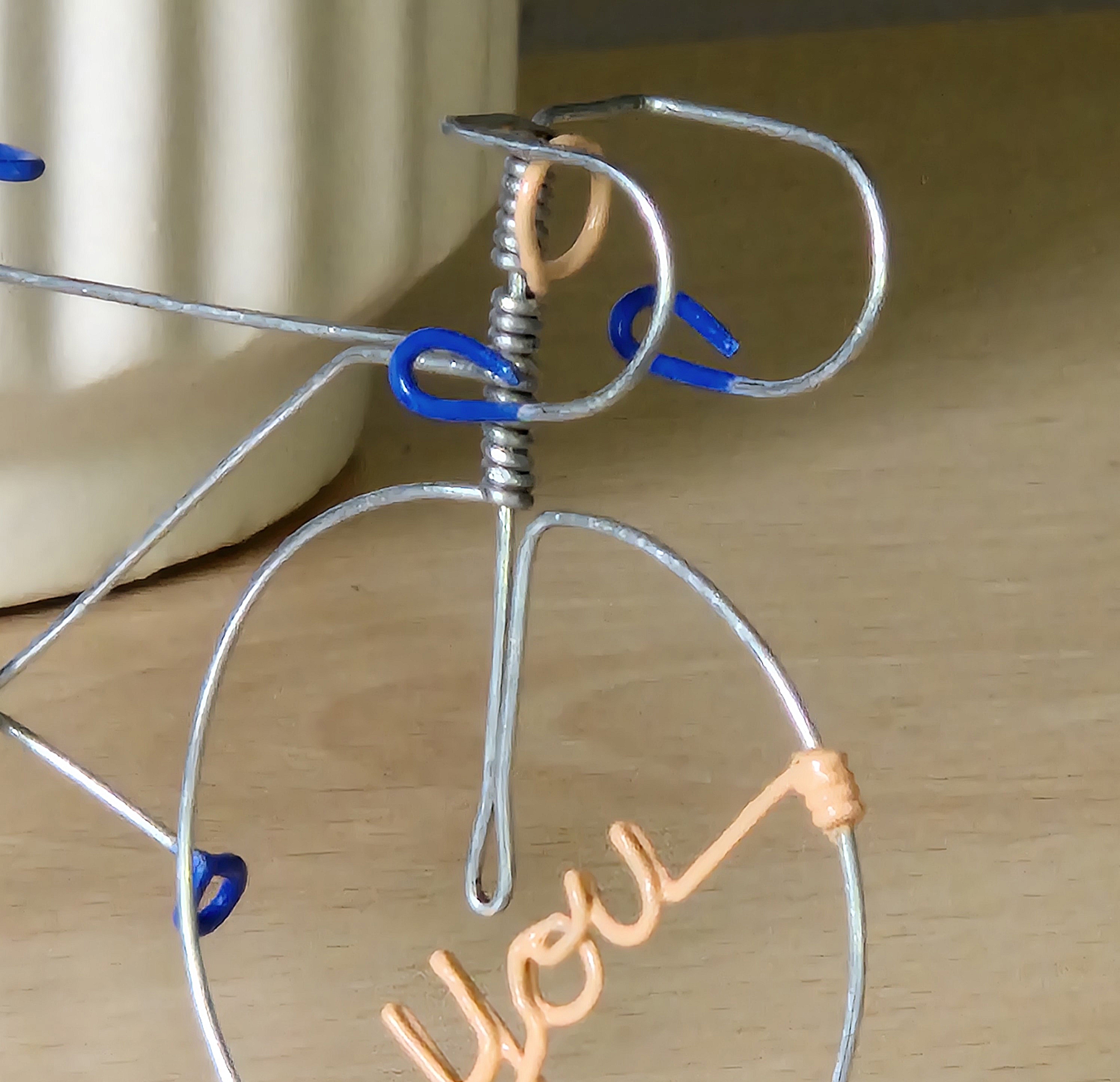 🎨 Matériaux : vélo artisanal entièrement réalisé à la main avec du fil de fer, message “For You” dans les roues en fil d’aluminium.