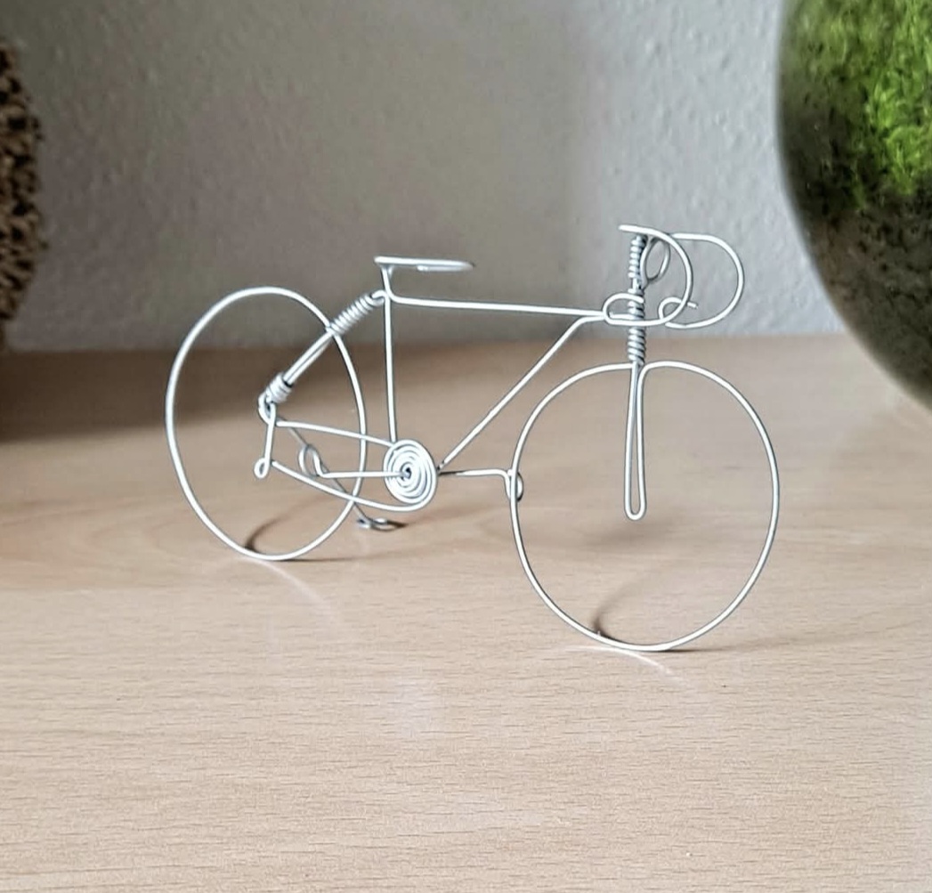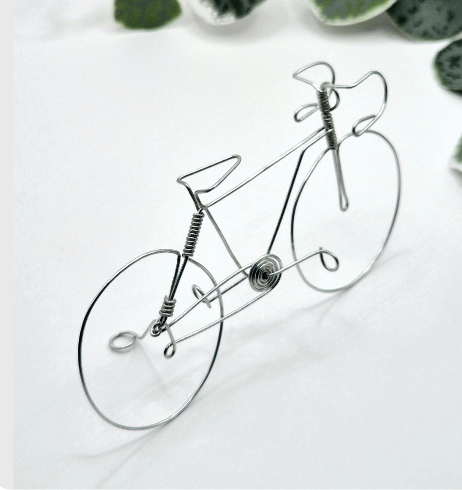 Ce joli petit vélo est entièrement réalisé à la main en fil de fer. Pour le créer, j’utilise une technique de pliage et m’aide de différentes pinces.