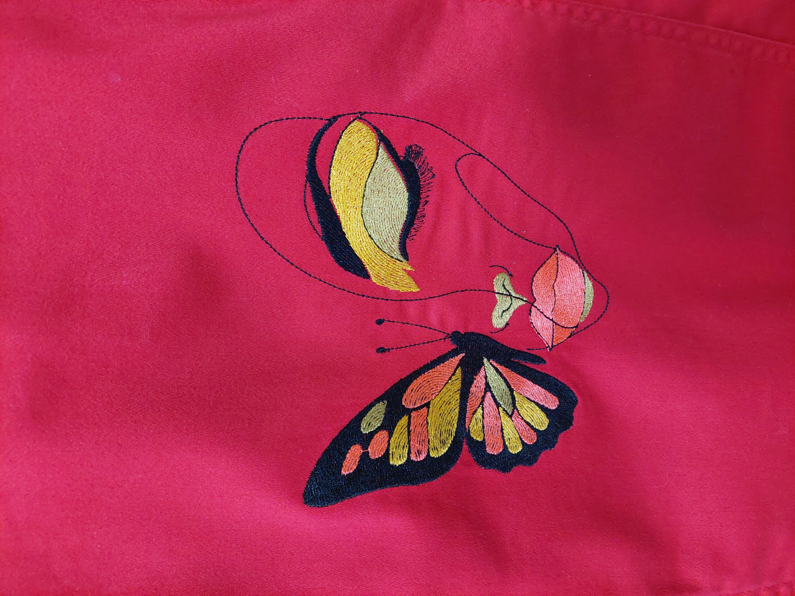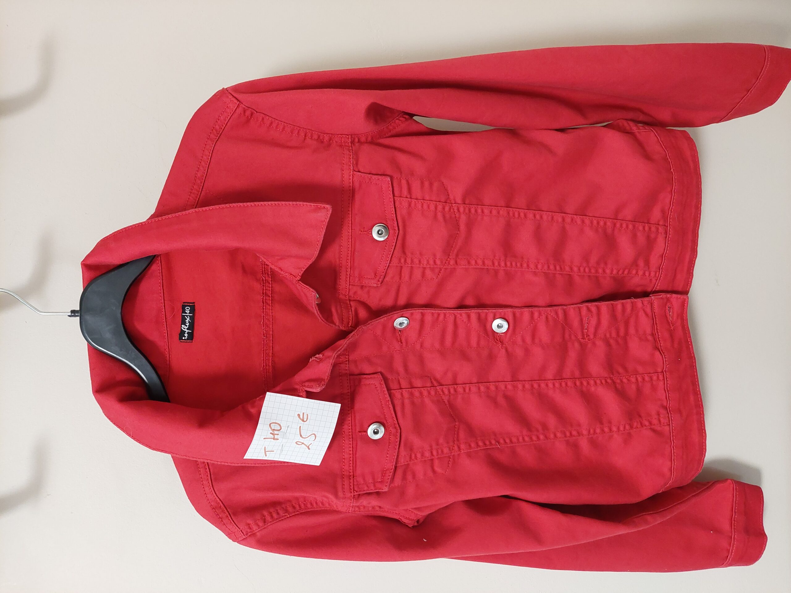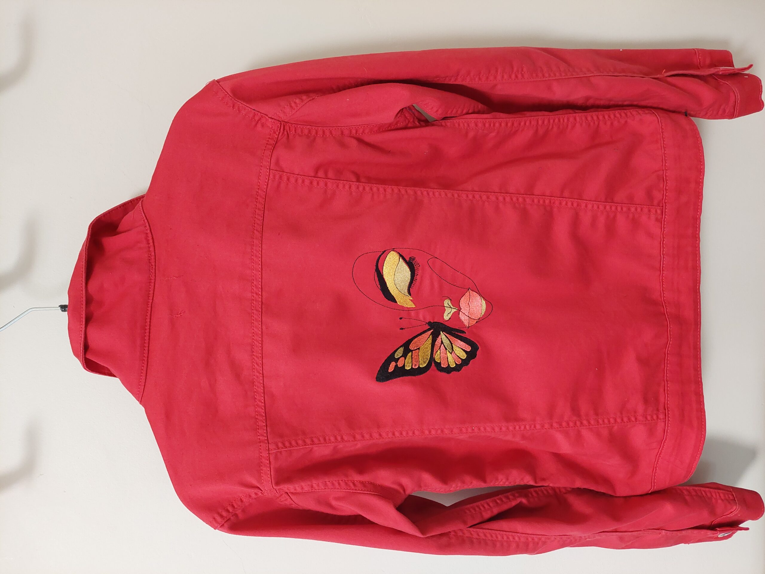 Veste jean rouge taille 40 customisée au dos avec broderie femme et papillon.