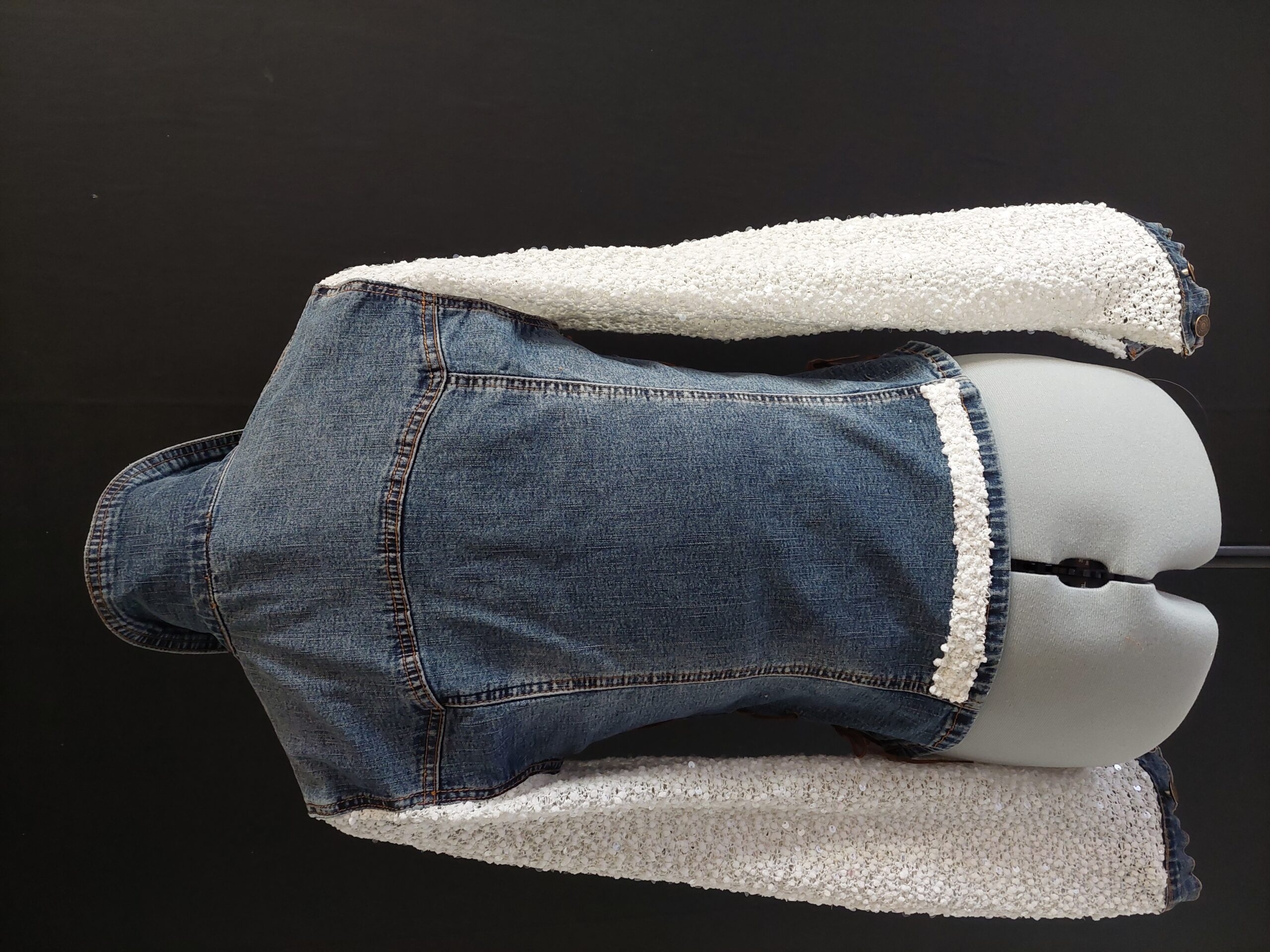 Customisation des manches avec de la dentelle avec sequins , très douce à l’intérieur, et rappel de cette étoffe sur le bas de la veste.