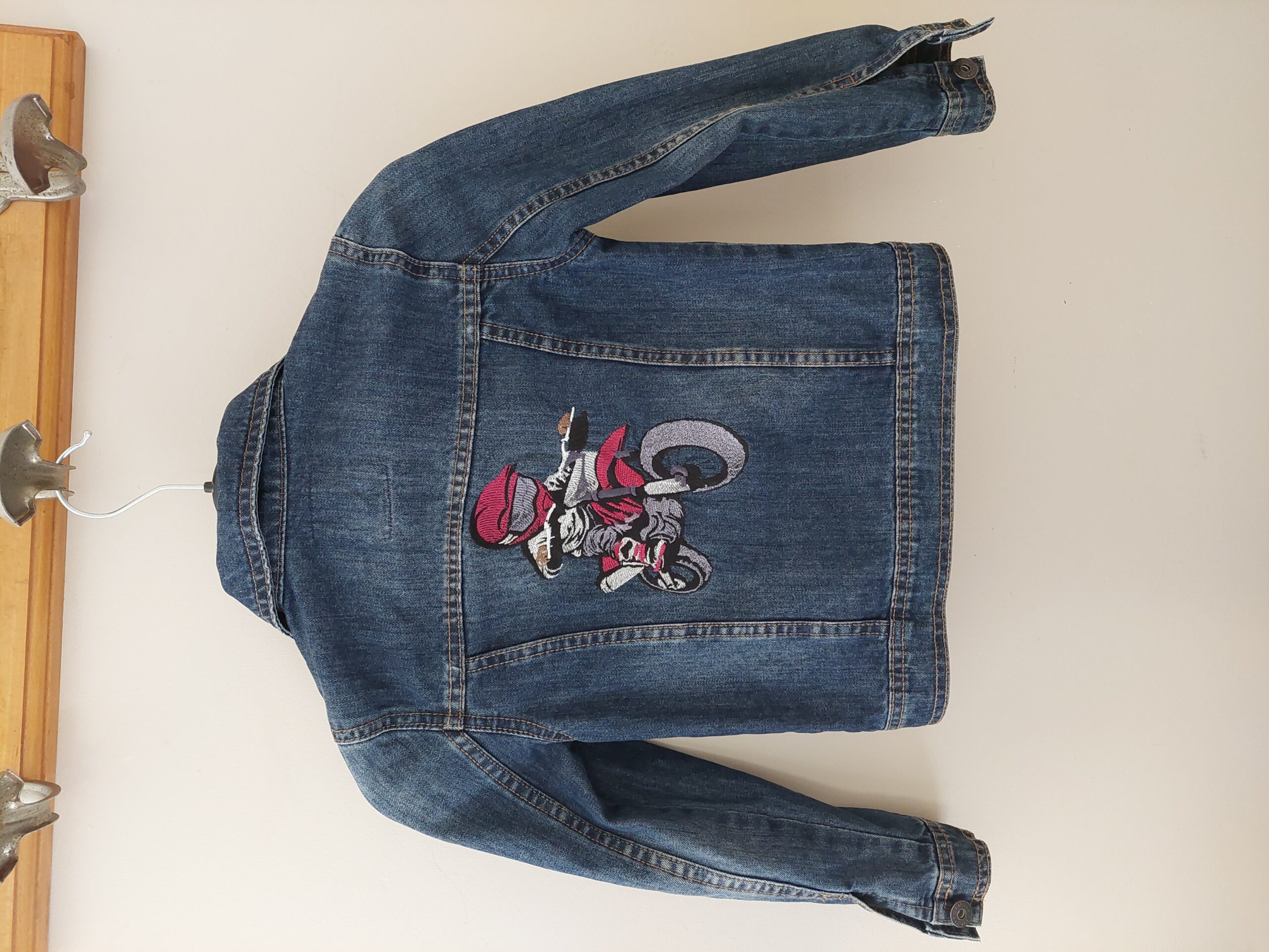 Veste en jean customisée avec broderie moto cross au dos ( 37000 points 1h15 de broderie machine)